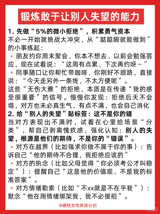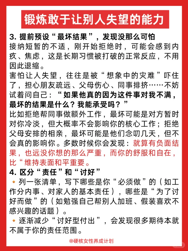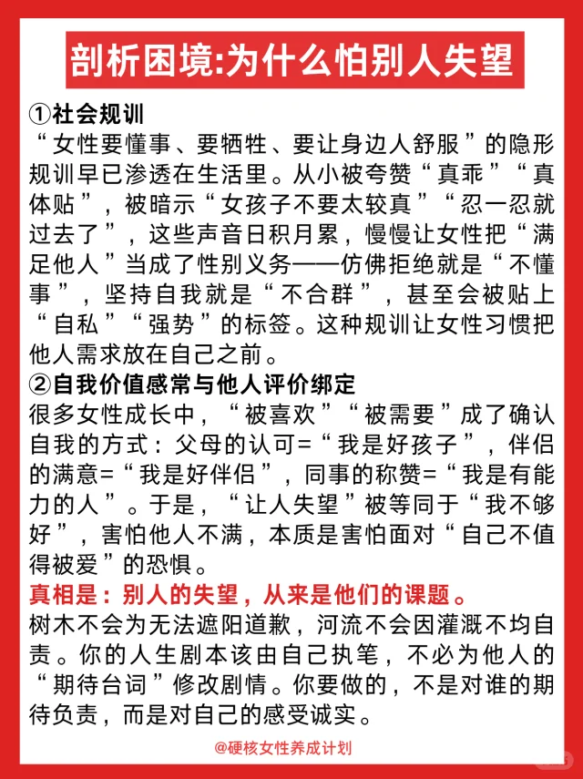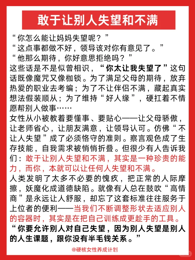 1️⃣学会让父母失望,不必困在“以爱为名”的牢笼里,不必为满足他们对婚姻、职业的期待而扭曲自我,你有权坚持自己对生活的真实想法,他们的期待里藏着爱,但也可能藏着时代的局限——你要做的,不是推翻爱,而是分清“你的人生”和“他们的期待”;