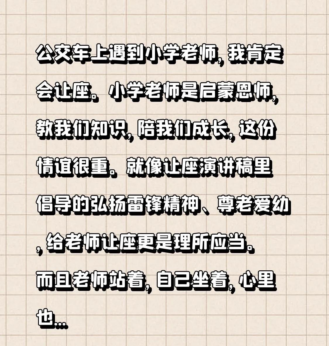 公交车上遇到小学老师,我肯定会让座。小学老师是启蒙恩师,教我们知识,陪我们成长,这份情谊很重。就像让座演讲稿里倡导的弘扬雷锋精神、尊老爱幼,给老师让座更是理所应当。而且老师站着,自己坐着,心里也会过意不去。想象一下,老师辛苦教学,现在站在摇晃的车厢里,咱哪能坐得住?让座是对老师的尊重,也是对过往师生情的回馈,这事儿没商量。