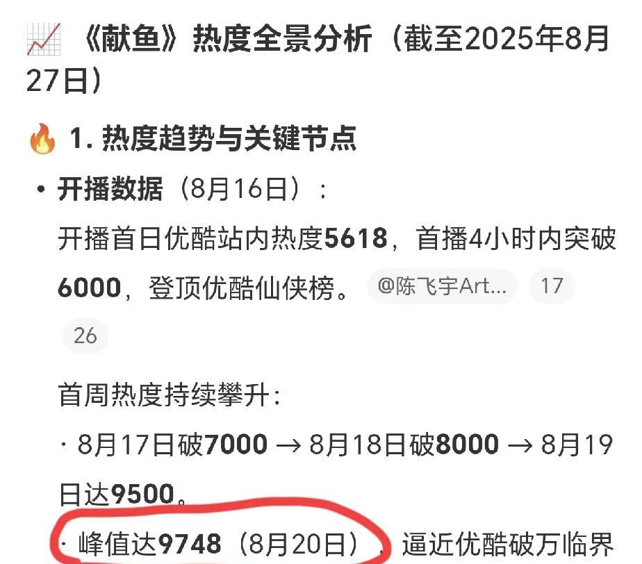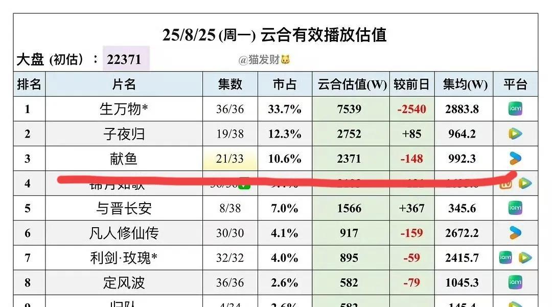 我去查了一下,《献鱼》目前最高的热度是8月20日的9748,目前集均马上突破1000万。 离大结局还有几天,我觉得按照目前的集均破万是有点难度的,尤其是马上开学了,学生们都该上交手机了,古偶最大的观众就要退场了。