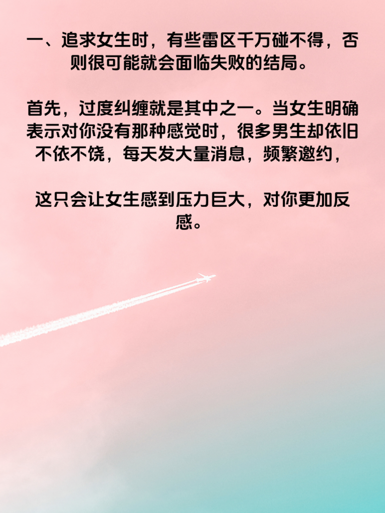 一、追求女生时,有些雷区千万碰不得,否则很可能就会面临失败的结局。首先,过度纠缠就是其中之一。当女生明确表示对你没有那种感觉时,很多男生却依旧不依不饶,每天发大量消息,频繁邀约,这只会让女生感到压力巨大,对你更加反感。 二、还有,不懂尊重她的生活和想法也是大忌。每个人都有自己的空间和喜好,如果你总是强行干涉她的决定,按照自己的意愿去安排她的生活,她会觉得失去了自由,从而对你产生抵触情绪。 三、再者,一味地讨好而没有自我也不可取。为了迎合女生,你放弃了自己的原则和底线,什么都顺着她,这样会让你逐渐失去自身的魅力。女生往往会欣赏有主见、有个性的男生,而不是毫无原则的附庸。所以,追求女生时一定要避开这些雷区,用正确的方式去赢得她的芳心。