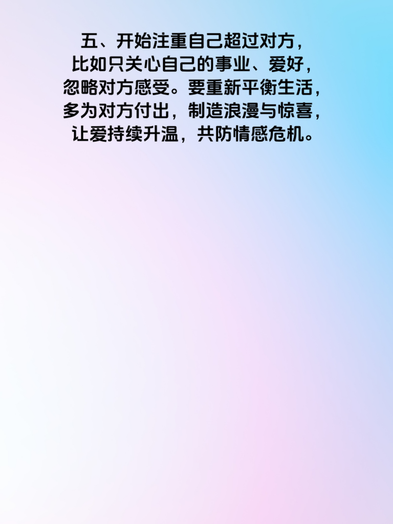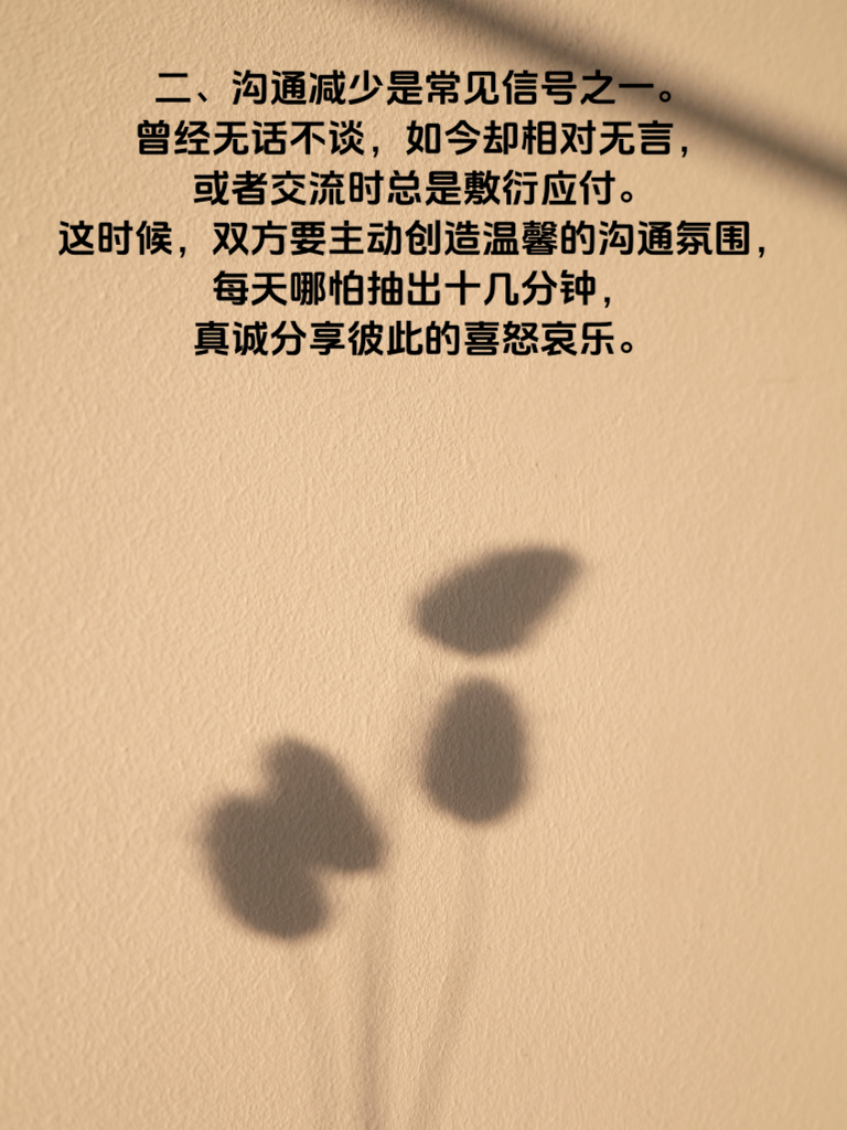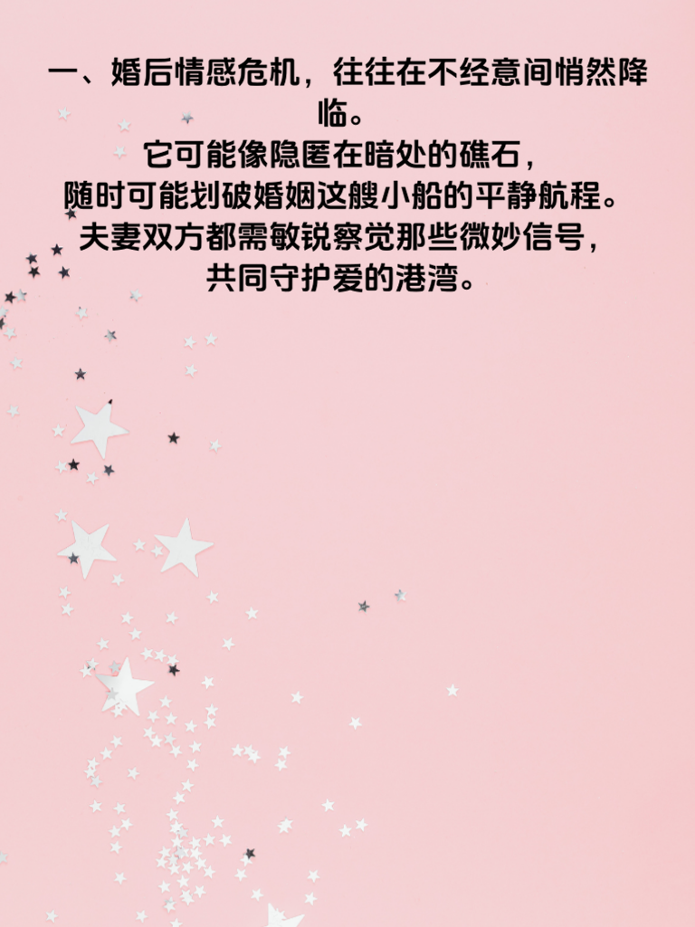 一、婚后情感危机,往往在不经意间悄然降临。它可能像隐匿在暗处的礁石,随时可能划破婚姻这艘小船的平静航程。夫妻双方都需敏锐察觉那些微妙信号,共同守护爱的港湾。 二、沟通减少是常见信号之一。曾经无话不谈,如今却相对无言,或者交流时总是敷衍应付。这时候,双方要主动创造温馨的沟通氛围,每天哪怕抽出十几分钟,真诚分享彼此的喜怒哀乐。 三、互相指责也是危险信号。一点小事就互相埋怨、指责,只会让矛盾升级。要学会换位思考,理解对方的立场,用温和的语气表达自己的想法和感受。 四、性生活不和谐同样影响深远。这可能源于压力、疲惫等,但不能忽视。夫妻应坦诚交流彼此需求,共同探索增进亲密感的方法。 五、开始注重自己超过对方,比如只关心自己的事业、爱好,忽略对方感受。要重新平衡生活,多为对方付出,制造浪漫与惊喜,让爱持续升温,共防情感危机。