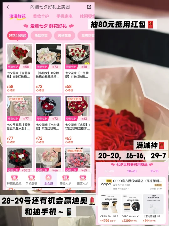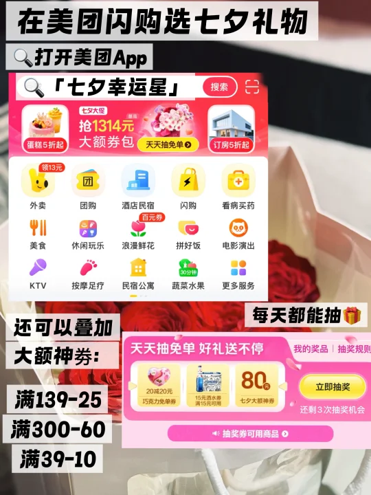 眼瞅着快到七夕,他又趁我上班时偷偷在美团闪购给我选了喜欢的鲜花,还说现在美团闪购七夕活动多,选哪个都划算,直接在美团APP搜索“七夕幸运星”就行,神券根本领不完。39-10、139-25、300-60的神券都可以叠加产品活动价使用,还有超多神券可以抽,简直不要太划算!他说28号-29号还有概率获得迪奥口红和手机,他直接参与了,说可能我们就是下一个幸运儿呢。