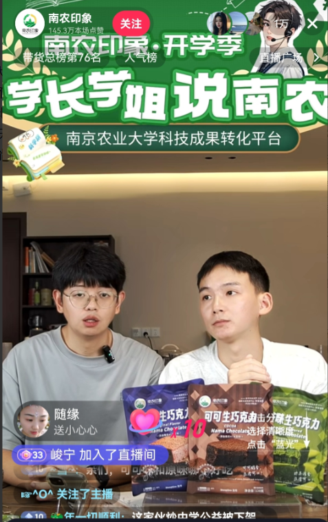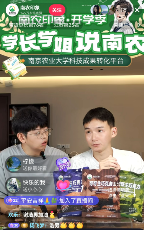 浩南助力开学 浩南助力南农印象开学季。南农大学,请到浩南来助播半小时,人气上升非常快哦!半小时涨了大几千粉哦!卖出不少产品哦!浩南讲品也讲得非常好!就是看上去相对疲惫,应该是学业很重,事情比较多。来了半小时,就回实验室去了。 最后浩南说,要过好自己的每一天,经历大多事得,主要是希望大家身体健康,有了身体才是有了一切,身体棒棒,能吃能睡才是最好,其他的都不是那么重要。