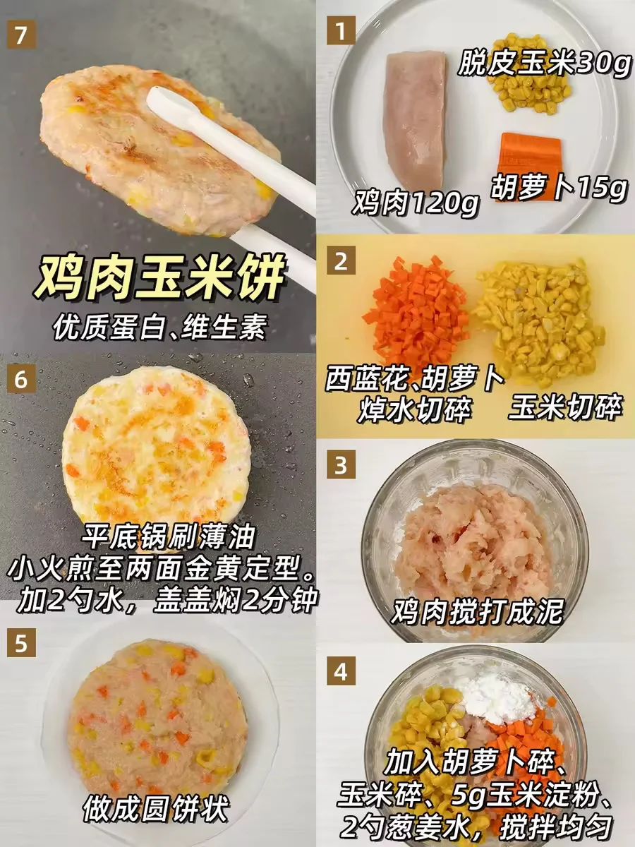 鸡胸肉120g、玉米粒30g(去皮)、胡萝卜15g、葱姜水10ml、玉米淀粉5g