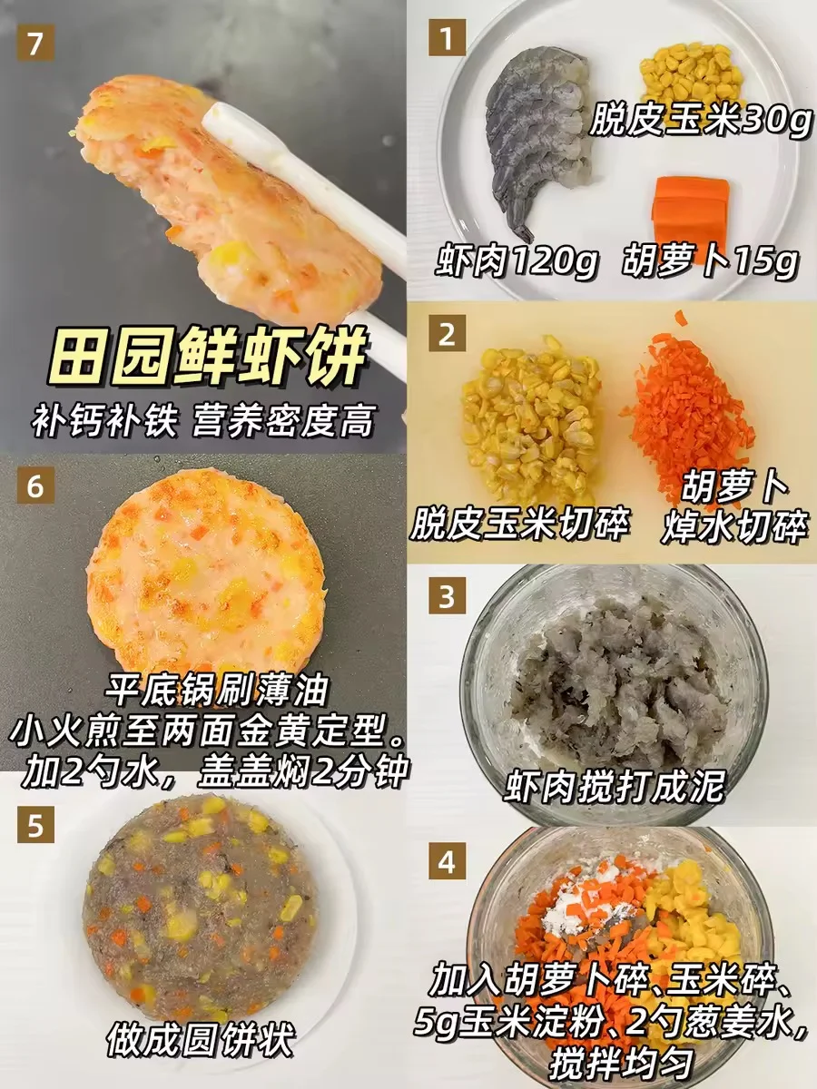 虾肉120g、玉米30g、胡萝卜15、葱姜水10ml、玉米淀粉5g
