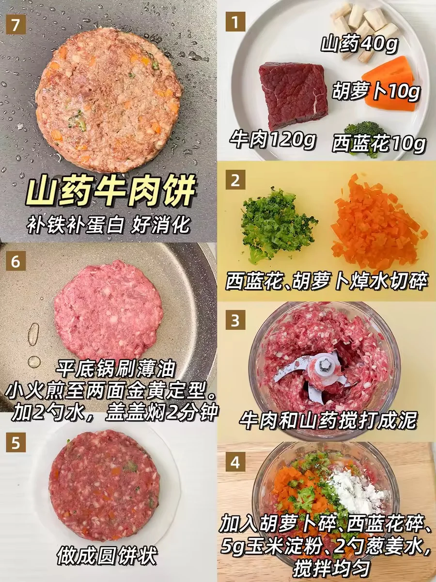 牛肉120g、山药40g、胡萝卜10g、西蓝花10g、葱姜水10ml、玉米淀粉5g