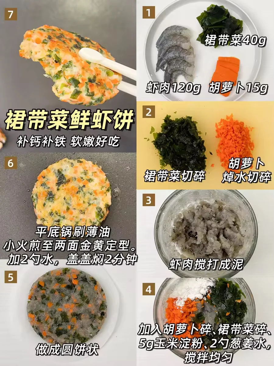 虾肉120g、裙带菜40g、胡萝卜15g、葱姜水10ml、玉米淀粉5g