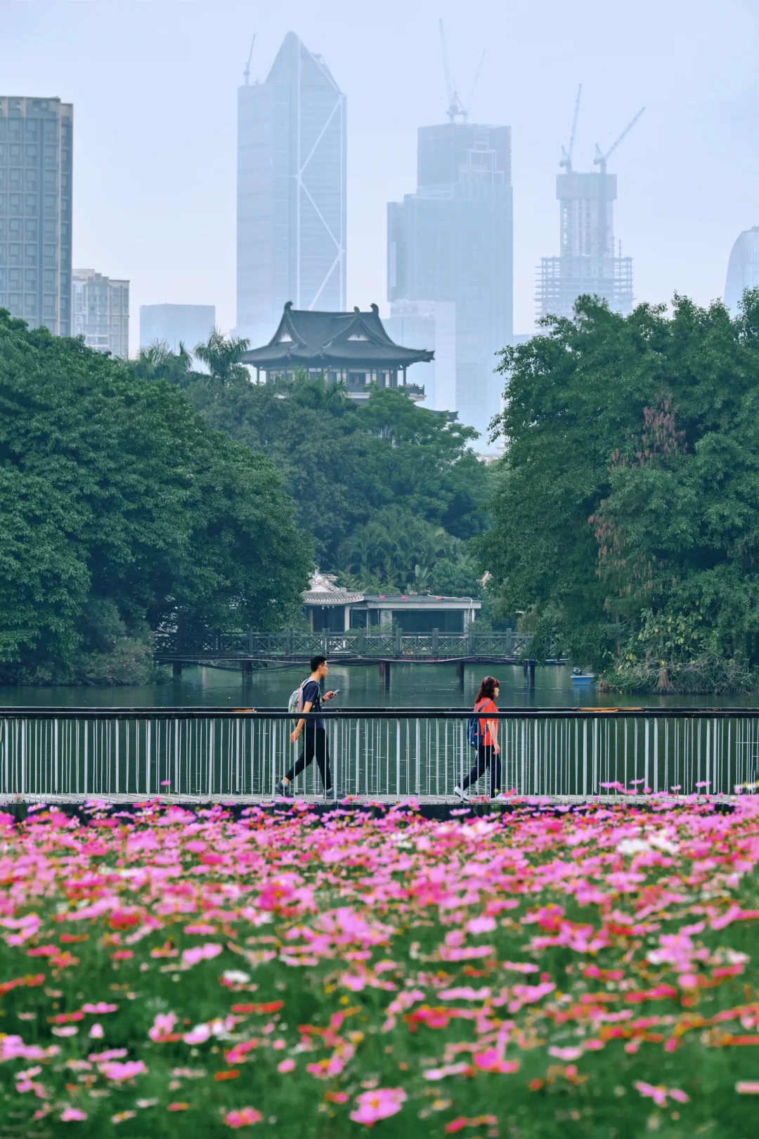 1️⃣人物站在花海前,花海湖畔广州塔为背景,手机开启2X模式,就可以拍到花海与三件套同框啦