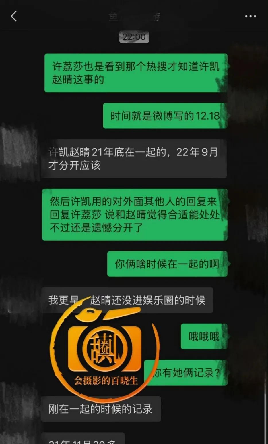 没想到许凯、赵晴这个瓜还能跟泳坛有关系…… 近日,许凯、赵晴与许荔莎的三角恋情风波持续发酵,此前赵晴被曝与许凯在深圳幽会前另有正牌男友。有消息称赵晴的前男友并非娱乐圈人士,而是国家游泳队助教毛飞廉,从聊天记录来看,两人恋爱期间十分甜蜜。 一张疑似毛飞廉与朋友的聊天截图显示,毛飞廉首先向朋友询问了赵晴与许凯幽会消息曝光的时间,随后情绪激动地表示“赵晴与许凯搞一起后把我踹了”,并提及自己与赵晴早在赵晴进入娱乐圈之前便已确立了恋爱关系。 狗仔曝光的信息,是说赵晴和许凯互相劈腿原配才在一起的,不然毛飞廉也不会关注许荔莎了。毛飞廉还声称许凯和赵晴2021年底开始交往,2022年9月就分手了。
