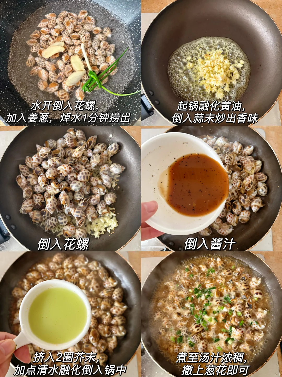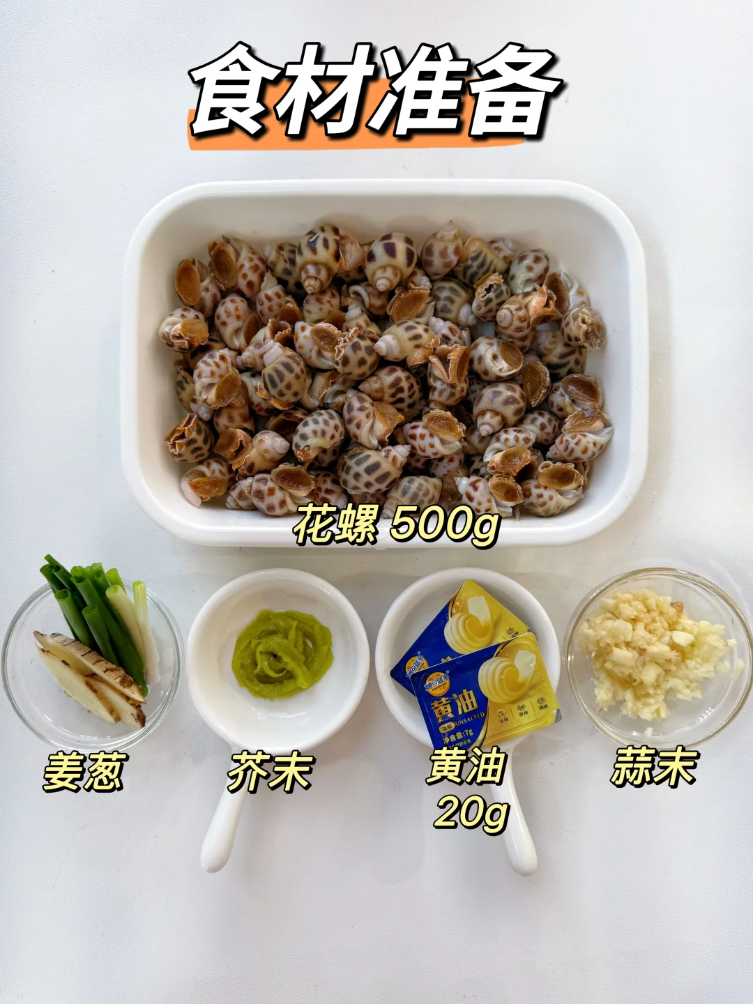 📝【食材】:花螺、黄油、蒜末、芥末、姜葱