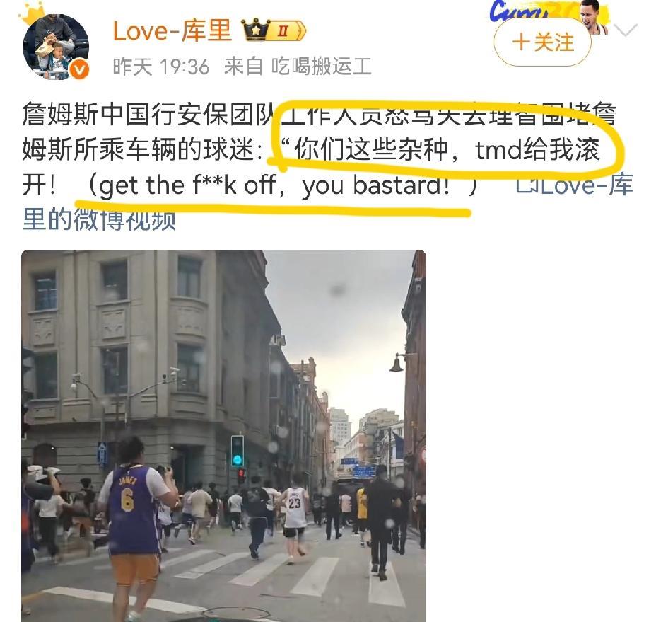 球迷们 再怎么追星,也应该有理有度 詹姆斯 不至于和一些其他球员那样。在美国揭不开锅才来中国之行的 看看,人家安保的词语吧: get the fuck off ,you bastard 译成中文: 你们这些杂 种,tmd 给我滚开 何必要这样?又何必激动到这种地步 知廉耻,知进退 自强不息,厚德载物! #秋日生活打卡季# #詹姆斯#