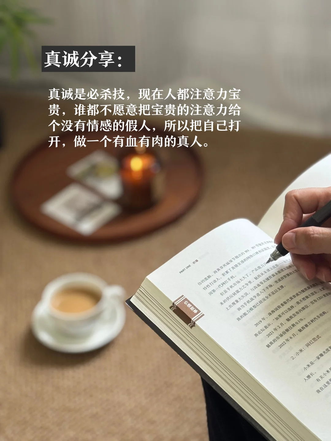 ✅ 真诚分享:真诚是必杀技,现在人都注意力宝贵,谁都不愿意把宝贵的注意力给个没有情感的假人,所以把自己打开,做一个有血有肉的真人。