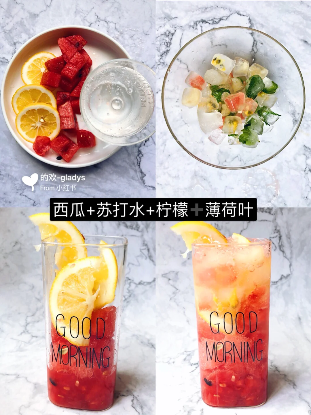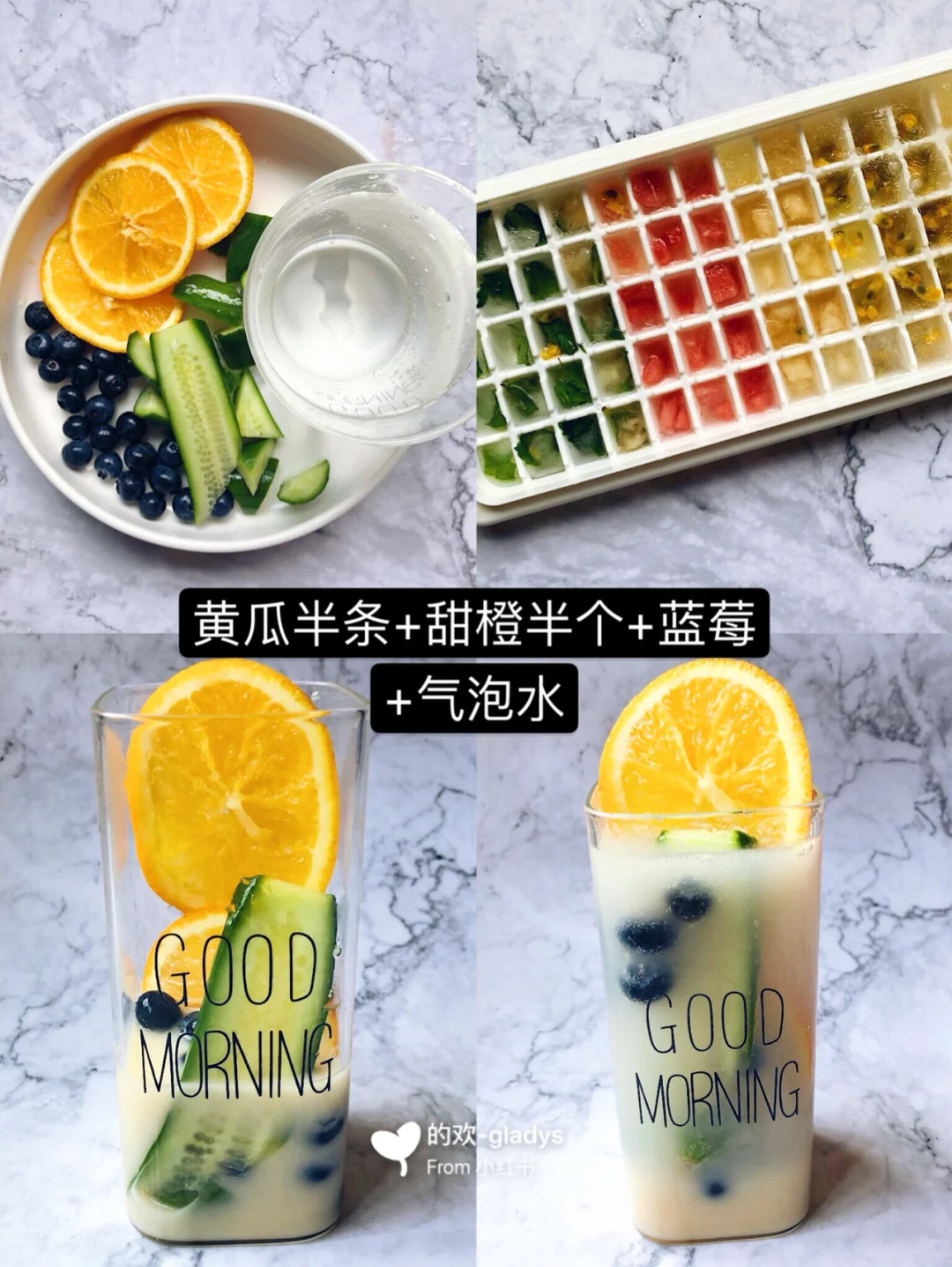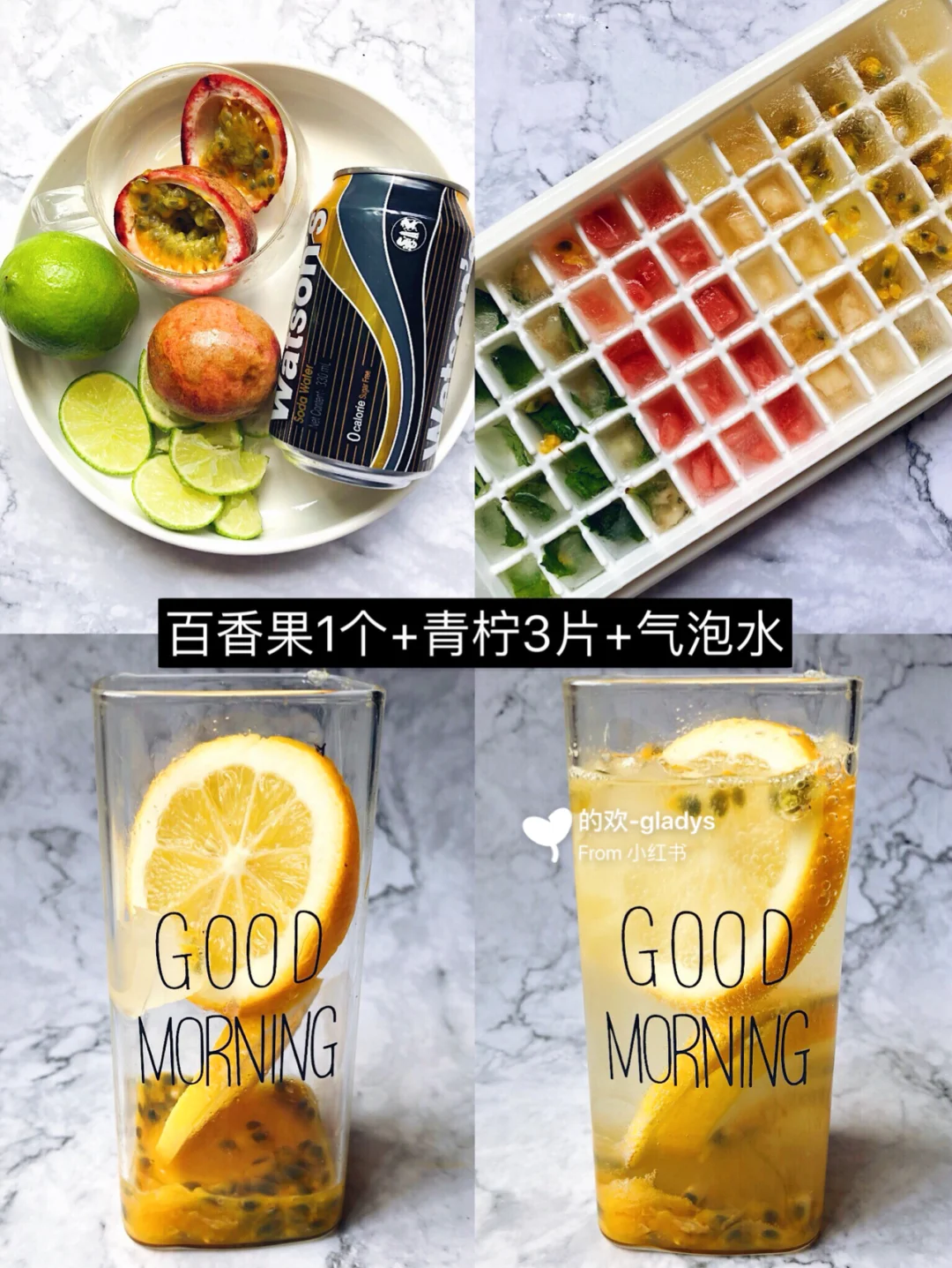 夏天补水好喝的同时🌞远离过多糖份添加的的饮料,自制一杯清香养颜的水果茶。保持好身材,西柚满满维c通畅每一天,柠檬西瓜解暑好好办 🍉【附上低卡水果茶公式=维c多的水果+水+自制冰块+薄荷叶】🍉 👉🏻1.维c多的水果=西柚/柠檬/百香果/桃子/蓝莓/西瓜/苹果/荔枝 👉🏻2.水=气泡水/养乐多/低卡雪碧/ 👉🏻3.自制冰块=提前在冰格中放入喜欢的水果/薄荷叶+水 冷藏 ——🍉9款 夏日低卡养颜 水果茶—— 🍊西柚养乐多气泡水(维c丰富+通畅) 食材:西柚半个+低糖养乐多+气泡水 方法:分层效果=先把西柚果肉取出放杯底,再加入冰块,气泡水沿杯壁倒入 🍋百香果青柠气泡水(美白+维c) 食材:百香果1个+自制冰块+青柠3片+气泡水 方法:冰块提前准备好,可以在冰块中放入百香果,依次放入杯中就好 🍉西瓜柠檬水(解暑 清凉) 食材:薄荷叶+西瓜+苏打水➕柠檬 方法:西瓜放入冰格自制冰块,冻好后和西瓜放入杯中,加上薄荷叶。 平时吃西瓜太凉,可以自制西瓜水综合一下哦 🍑蜜桃柠檬汽水(多吃时灵水果) 食材:水蜜桃+柠檬+自制冰块+低卡汽水 方法:水蜜桃切小块,和柠檬放入杯中变碎,放入冰块和苏打水。 👩‍🌾蓝莓青柠低卡雪碧(对眼睛好) 食材:蓝莓+青柠+自制冰块+低卡雪碧/气泡水 做法:一年四季可以吃的蓝莓,快手搭配一杯,自带酸酸解暑口感 🥒黄瓜甜橙蓝莓水(抗氧化) 食材:黄瓜+甜橙+蓝莓+气泡水 蓝莓抗氧化适合一直对着电脑的宝宝,喜欢的食材都在里面 🌺荔枝薄荷蜜桃水(开胃消肿) 食材:黄瓜+荔枝5颗+蜂蜜可不加+水 荔枝对大脑🧠好,消肿止血,放在水中甜度刚刚好 🍎苹果柠檬胡萝卜咖啡(提神小可爱) 苹果咖啡的神仙组合,下午犯困来一杯,口感很特别哦,我这里咖啡没有,这次没有加 📒喜欢甜味的宝宝可以放点蜂蜜,不过我从来不加 嘿嘿。 让口感更好:在冰箱里冷鲜一下,更好喝一些,冰冻的小心哦。 选时令的水果☺让我们动动小手开始吧!记得常来看我哦,一起美美的