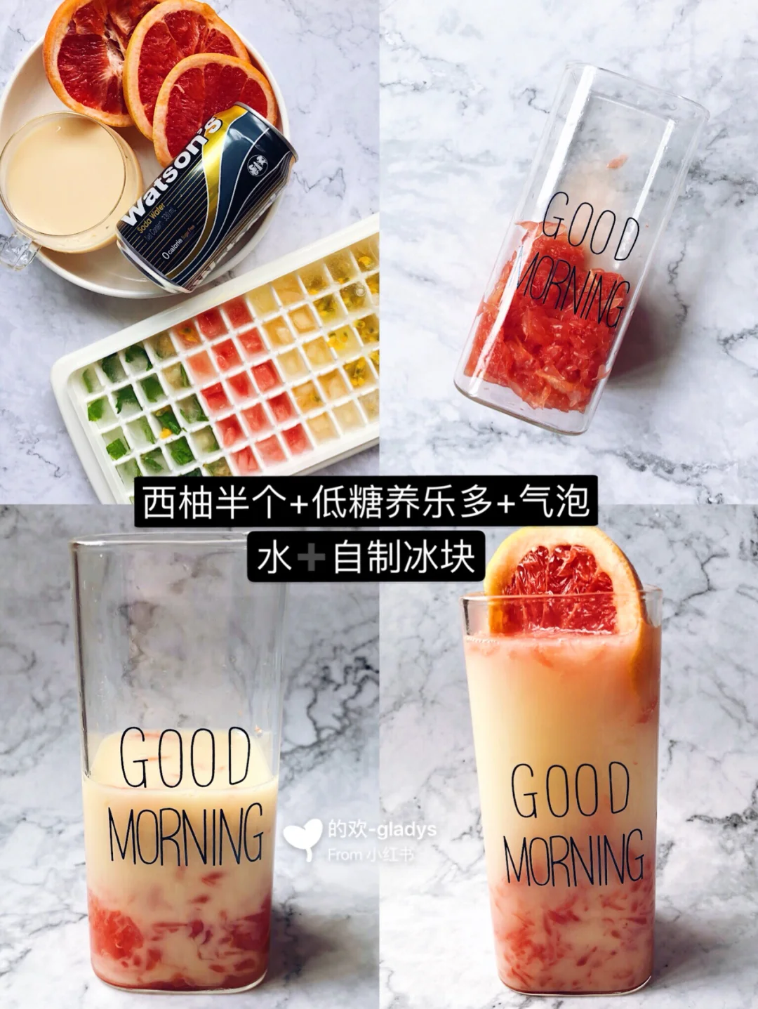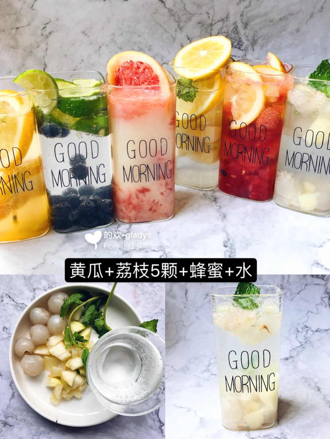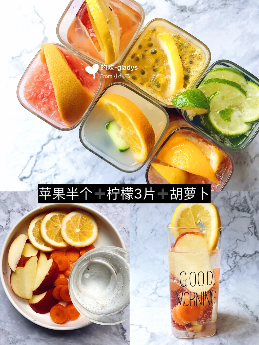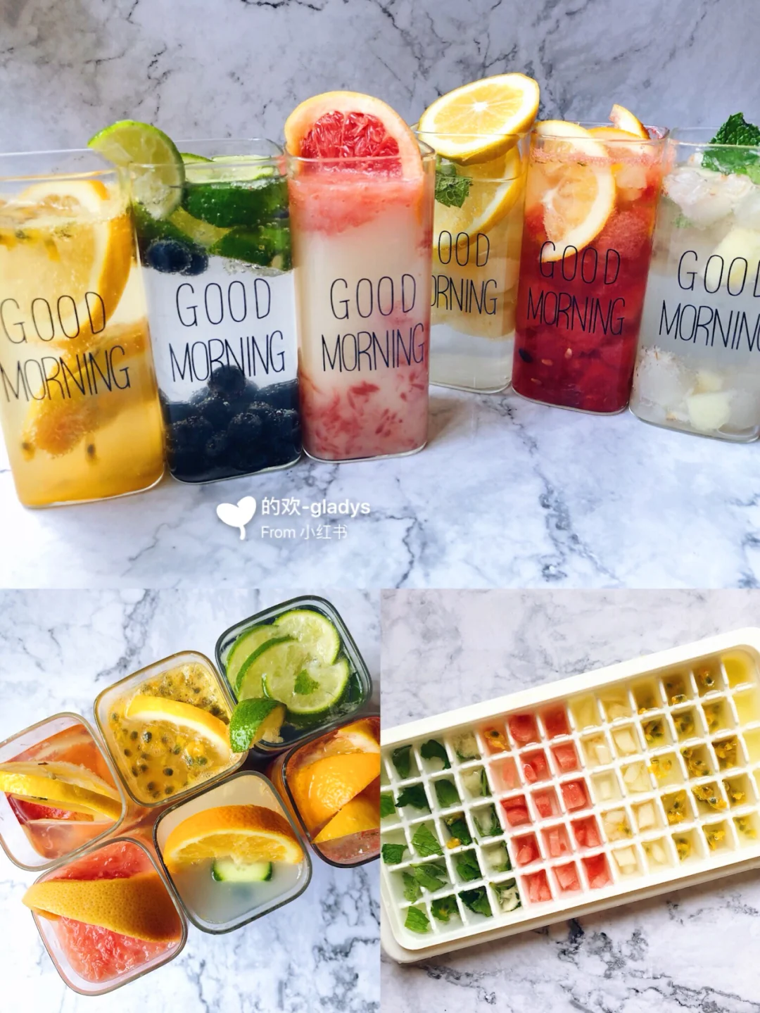 夏天补水好喝的同时🌞远离过多糖份添加的的饮料,自制一杯清香养颜的水果茶。保持好身材,西柚满满维c通畅每一天,柠檬西瓜解暑好好办 🍉【附上低卡水果茶公式=维c多的水果+水+自制冰块+薄荷叶】🍉 👉🏻1.维c多的水果=西柚/柠檬/百香果/桃子/蓝莓/西瓜/苹果/荔枝 👉🏻2.水=气泡水/养乐多/低卡雪碧/ 👉🏻3.自制冰块=提前在冰格中放入喜欢的水果/薄荷叶+水 冷藏 ——🍉9款 夏日低卡养颜 水果茶—— 🍊西柚养乐多气泡水(维c丰富+通畅) 食材:西柚半个+低糖养乐多+气泡水 方法:分层效果=先把西柚果肉取出放杯底,再加入冰块,气泡水沿杯壁倒入 🍋百香果青柠气泡水(美白+维c) 食材:百香果1个+自制冰块+青柠3片+气泡水 方法:冰块提前准备好,可以在冰块中放入百香果,依次放入杯中就好 🍉西瓜柠檬水(解暑 清凉) 食材:薄荷叶+西瓜+苏打水➕柠檬 方法:西瓜放入冰格自制冰块,冻好后和西瓜放入杯中,加上薄荷叶。 平时吃西瓜太凉,可以自制西瓜水综合一下哦 🍑蜜桃柠檬汽水(多吃时灵水果) 食材:水蜜桃+柠檬+自制冰块+低卡汽水 方法:水蜜桃切小块,和柠檬放入杯中变碎,放入冰块和苏打水。 👩‍🌾蓝莓青柠低卡雪碧(对眼睛好) 食材:蓝莓+青柠+自制冰块+低卡雪碧/气泡水 做法:一年四季可以吃的蓝莓,快手搭配一杯,自带酸酸解暑口感 🥒黄瓜甜橙蓝莓水(抗氧化) 食材:黄瓜+甜橙+蓝莓+气泡水 蓝莓抗氧化适合一直对着电脑的宝宝,喜欢的食材都在里面 🌺荔枝薄荷蜜桃水(开胃消肿) 食材:黄瓜+荔枝5颗+蜂蜜可不加+水 荔枝对大脑🧠好,消肿止血,放在水中甜度刚刚好 🍎苹果柠檬胡萝卜咖啡(提神小可爱) 苹果咖啡的神仙组合,下午犯困来一杯,口感很特别哦,我这里咖啡没有,这次没有加 📒喜欢甜味的宝宝可以放点蜂蜜,不过我从来不加 嘿嘿。 让口感更好:在冰箱里冷鲜一下,更好喝一些,冰冻的小心哦。 选时令的水果☺让我们动动小手开始吧!记得常来看我哦,一起美美的