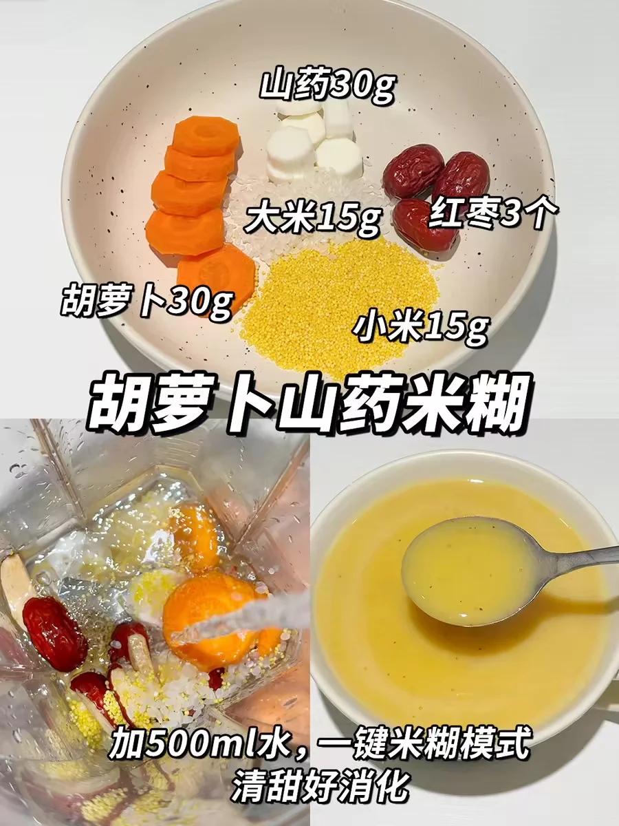 🥕胡萝卜山药米糊(小米15g、胡萝卜30g、山药30g、红枣3个)