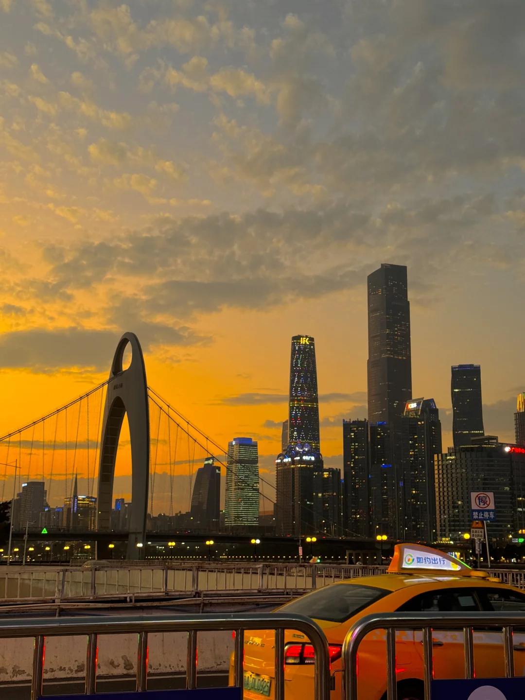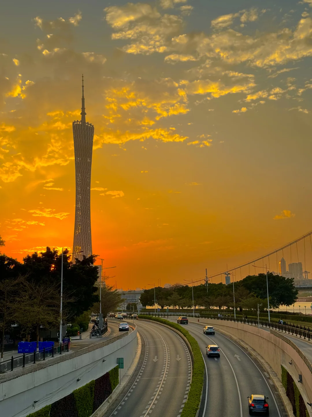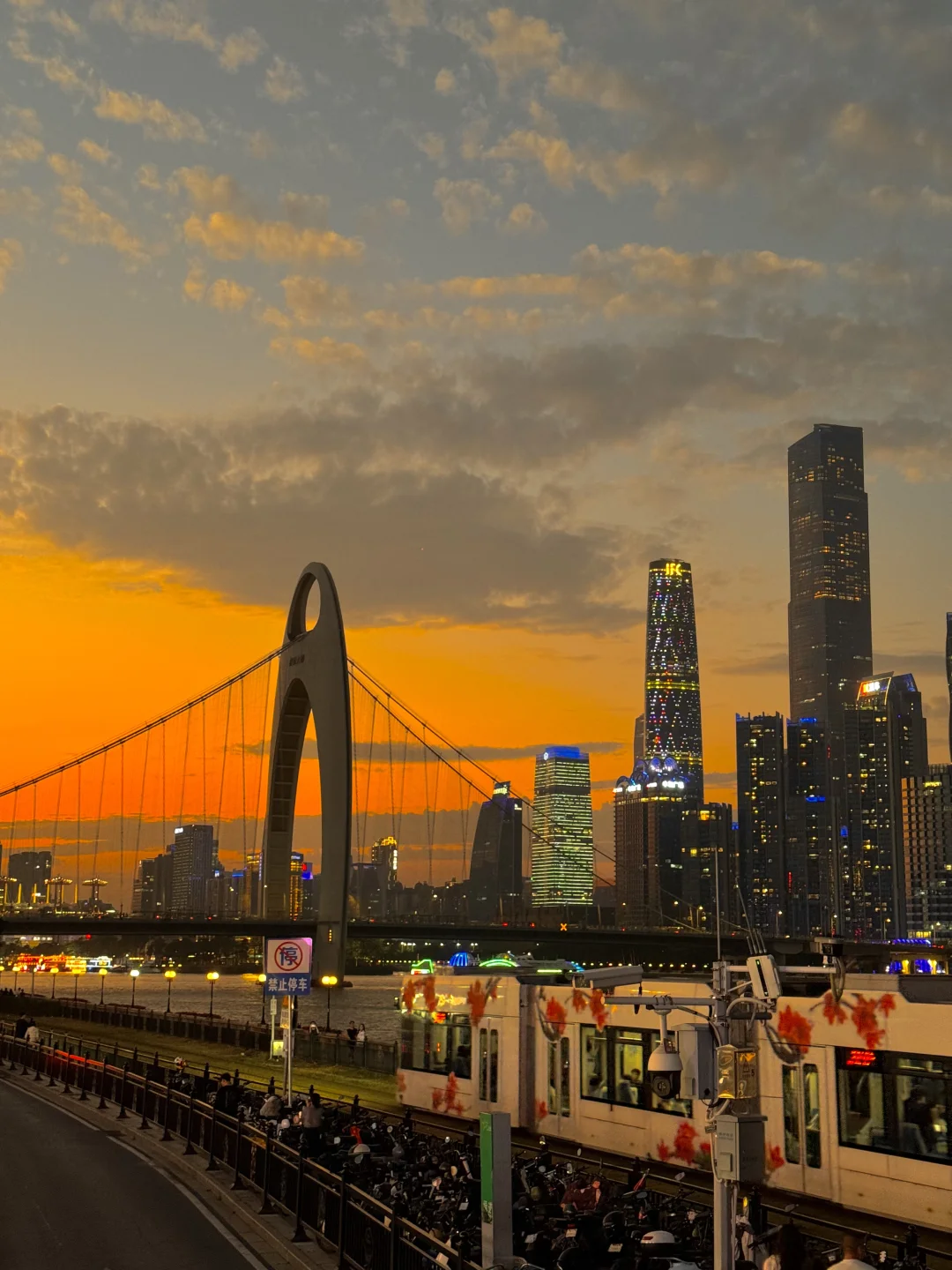 夕阳下猎德大桥横跨江面,有轨电车在江边穿梭🚃🚃云层被夕阳照得发光,夜幕降临,珠江新城的高楼像钻石星光般被点亮,小蛮腰披着赛博霓虹刺破暮色,江风带着livehouse飘来的旋律,把这一刻的浪漫吹进每个人眼底