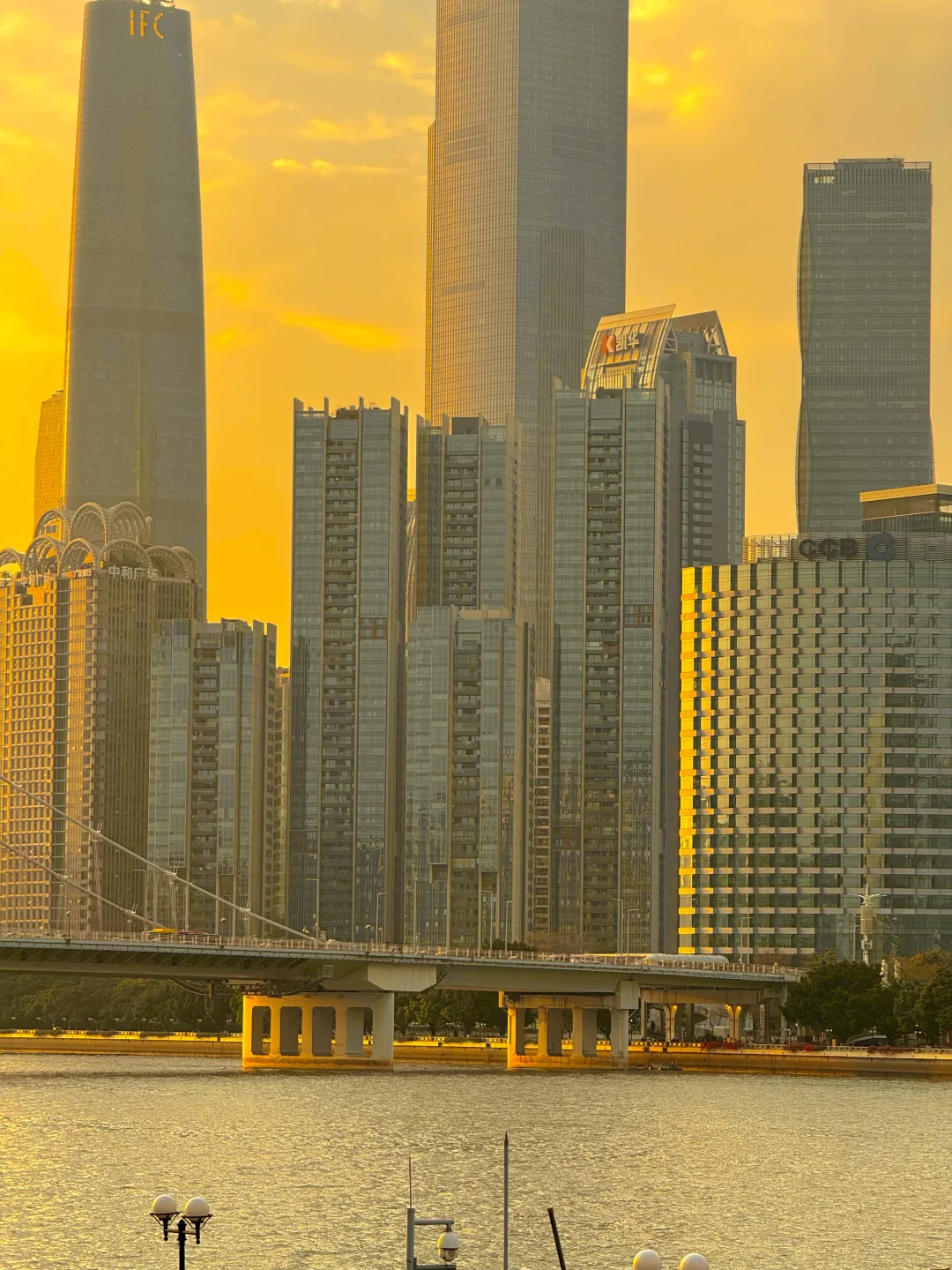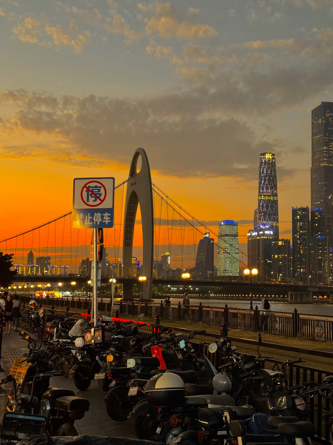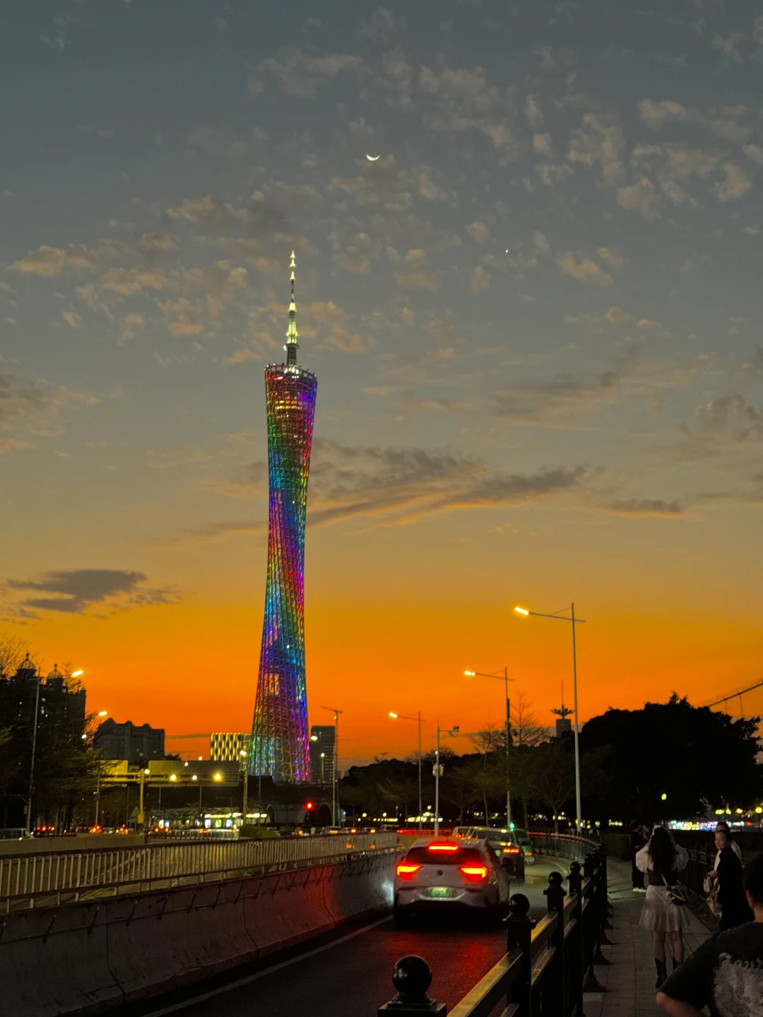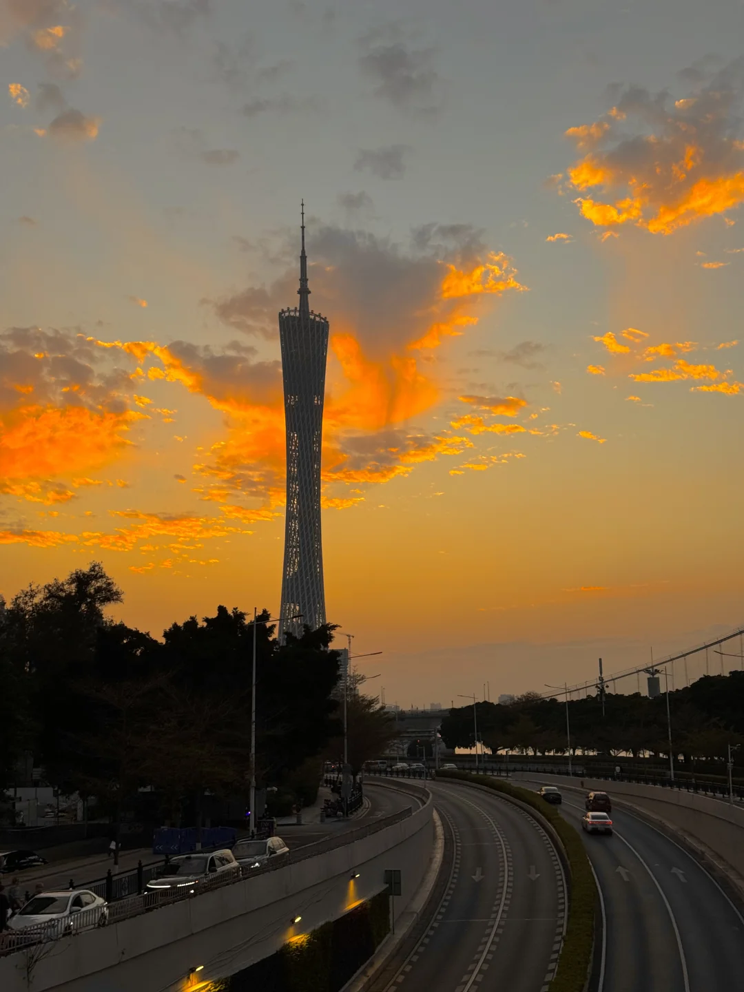 夕阳下猎德大桥横跨江面,有轨电车在江边穿梭🚃🚃云层被夕阳照得发光,夜幕降临,珠江新城的高楼像钻石星光般被点亮,小蛮腰披着赛博霓虹刺破暮色,江风带着livehouse飘来的旋律,把这一刻的浪漫吹进每个人眼底