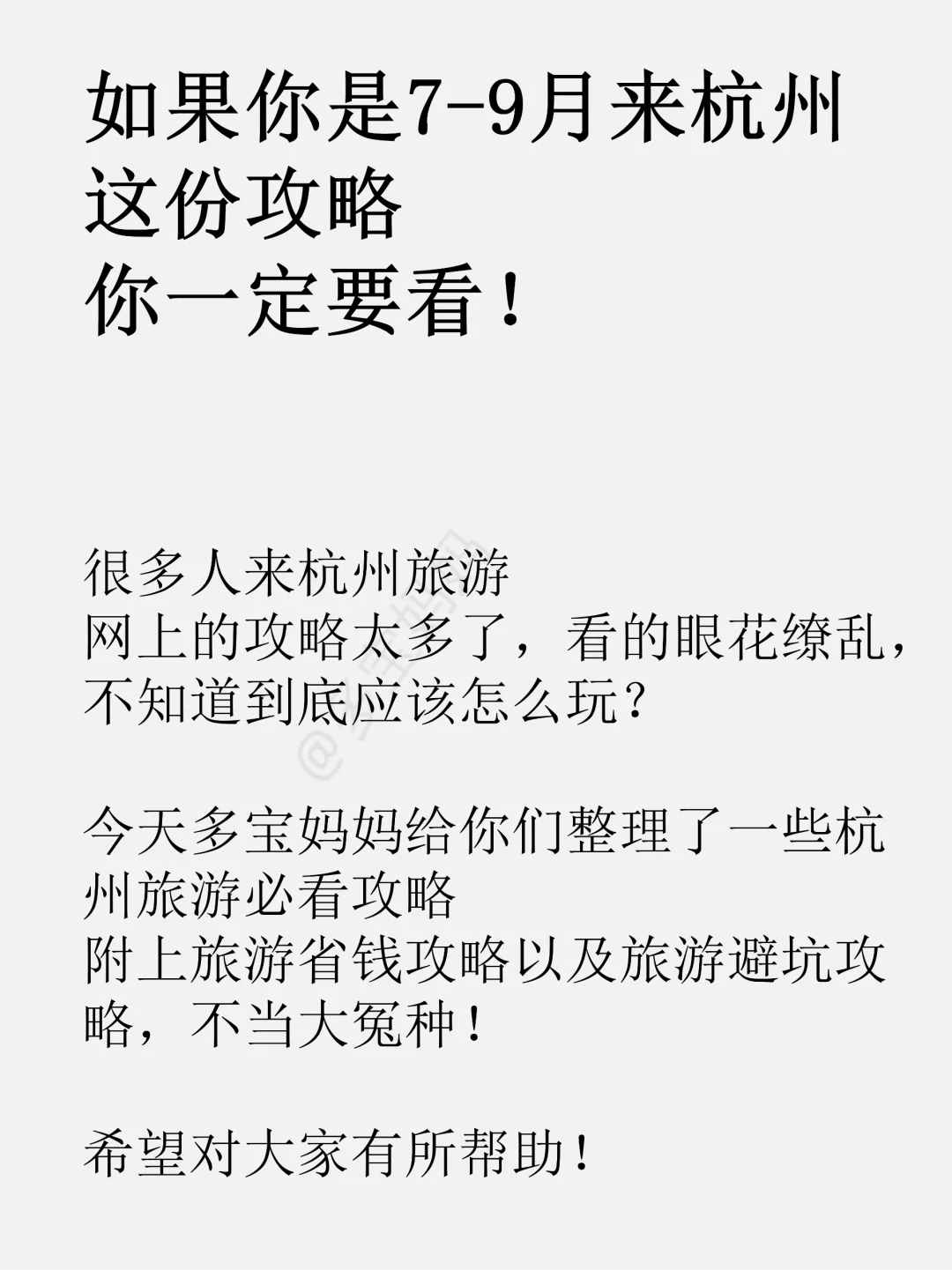暑假很多朋友会来杭州旅游 多宝妈妈给大家整理了一些注意事项 希望大家玩得开心 . ❤️关于天气 夏天的杭州,一个字,热 两个字,很热😭 👍但是夏天来杭州还是很美的,满眼都是绿色,很治愈 👆所以建议出去玩一定要起大早,然后玩好后回酒店睡一下,傍晚的时候再出来遛弯,很香 西湖不需要门票,所以起大早去很不错 . ❤️穿什么 短袖,裙子,短裤,防晒衣,防晒帽,防晒霜都要备着 . ❤️关于住哪里 👆最方便的住宿我推荐住西湖边 👆喜欢安静的可以住在茅家埠附近,离西湖,灵隐寺都比较近 👆或者住在龙翔桥地铁站附近,湖滨银泰边上,无论是逛西湖还是购物、交通都非常方便 👆住民宿的话,可以住青芝坞或者满觉陇,住在茶园里很特别。 👆住在南山路这条街也很不错,早起去西湖边看看风景,傍晚还可以长桥公园看看雷峰夕照,绝美 . ❤️关于交通 ⭐️杭州的火车站目前有杭州站,杭州东站,和杭州西站 ⭐️杭州站在西湖最中心,下来走几步就是五柳巷历史街区,河坊街 ⭐️杭州东站车次最多, . 杭州地铁很方便,建议坐地铁或者公交前往景点 西湖边可以步行结合自行车+观光车+西湖游船的方式 . ❤️关于来杭州吃什么 1.⭐️腿 老 大· 中 式 炸 鸡 (西湖湖滨店) 2.⭐️知 味 观(银泰店) 3.⭐️特色小吃:葱包烩,西湖藕粉 4.⭐️杭帮菜:绿茶,新白鹿餐厅,新丰小吃,外婆家等 详见图 7 . ‼️其他注意事项详见图片 . 👍对杭州旅游路线感兴趣的可以移步到合集查看 👏接下来,我会陆续分享杭州,桐庐,千岛湖,上海,安吉,连云港等旅游攻略 我是多宝妈妈,关注我,带你深度玩杭州😁 . 西湖 西溪湿地 灵隐寺 永福寺 千岛湖 笔记灵感 杭州旅游 杭州旅行 杭州旅遊攻略 杭州溜娃 周末去哪儿 灵隐寺祈福 周末去哪儿 杭州 杭州周末去哪儿 旅游攻略 出门过夏天 杭州夜景 西湖游船 西湖观光车 西湖美景 西湖落日 杭州赏荷 杭州亚运会 杭州亚运会旅游 这个中秋国庆去哪玩 . 夏天来杭州你要去哪里 [投票]