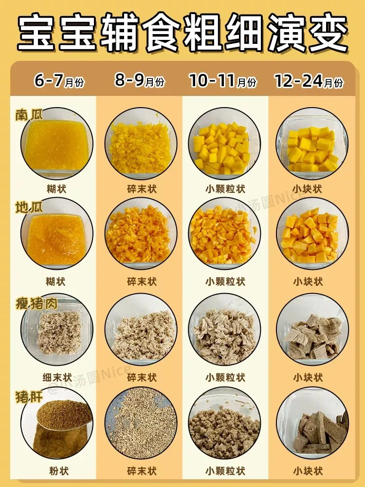 宝宝在添加辅食后,在不同的月份添加的食物粗细是不一样的⁉️根据不同性状,辅食可分为泥糊状食物、碎末状、碎块状、块状。