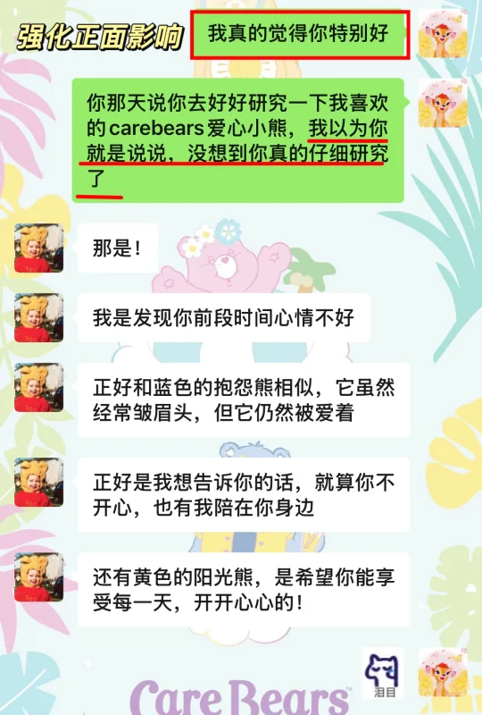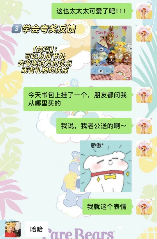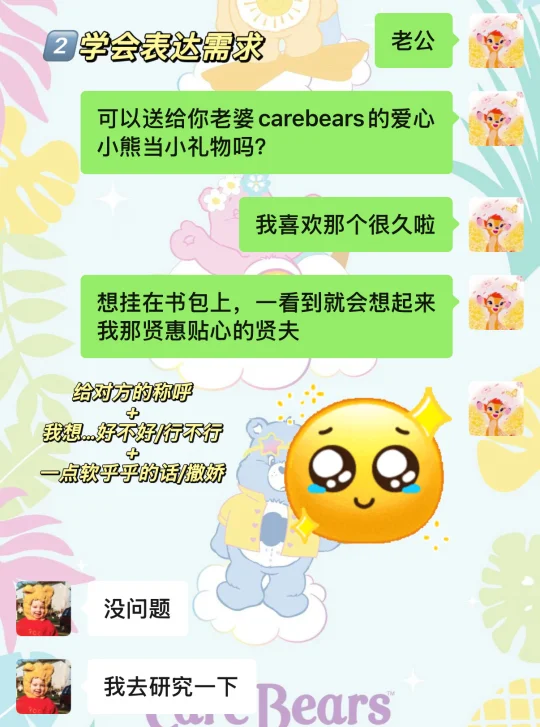 “老公,最近我心情不好,你能送我Care Bears爱心小熊当小礼物吗?我都喜欢很久了,一直想找机会让你送给我,毕竟你送我的和我自己买的不一样,你送给我的是你心意的象征,每次看到它们,我就会想起你对我的惦记,好不好?”