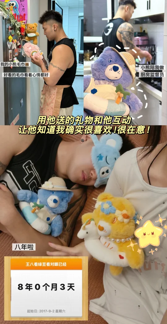 :“老公,你送我的Care Bears爱心小熊(礼物)也太好看了吧!!我每次看到它俩我都能想起咱俩(心情),小熊软乎乎的身体抱着它心情都变好了(结果),晚上我给你按摩犒劳一下你!(认可)”