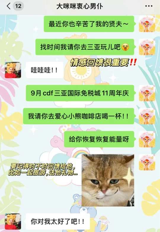“老公最近你也辛苦了,找时间休息一下我带你去三亚玩儿吧~正好9月cdf三亚国际免税城11周年庆,我请你去爱心小熊咖啡店喝一杯!给你恢复一下能量!”