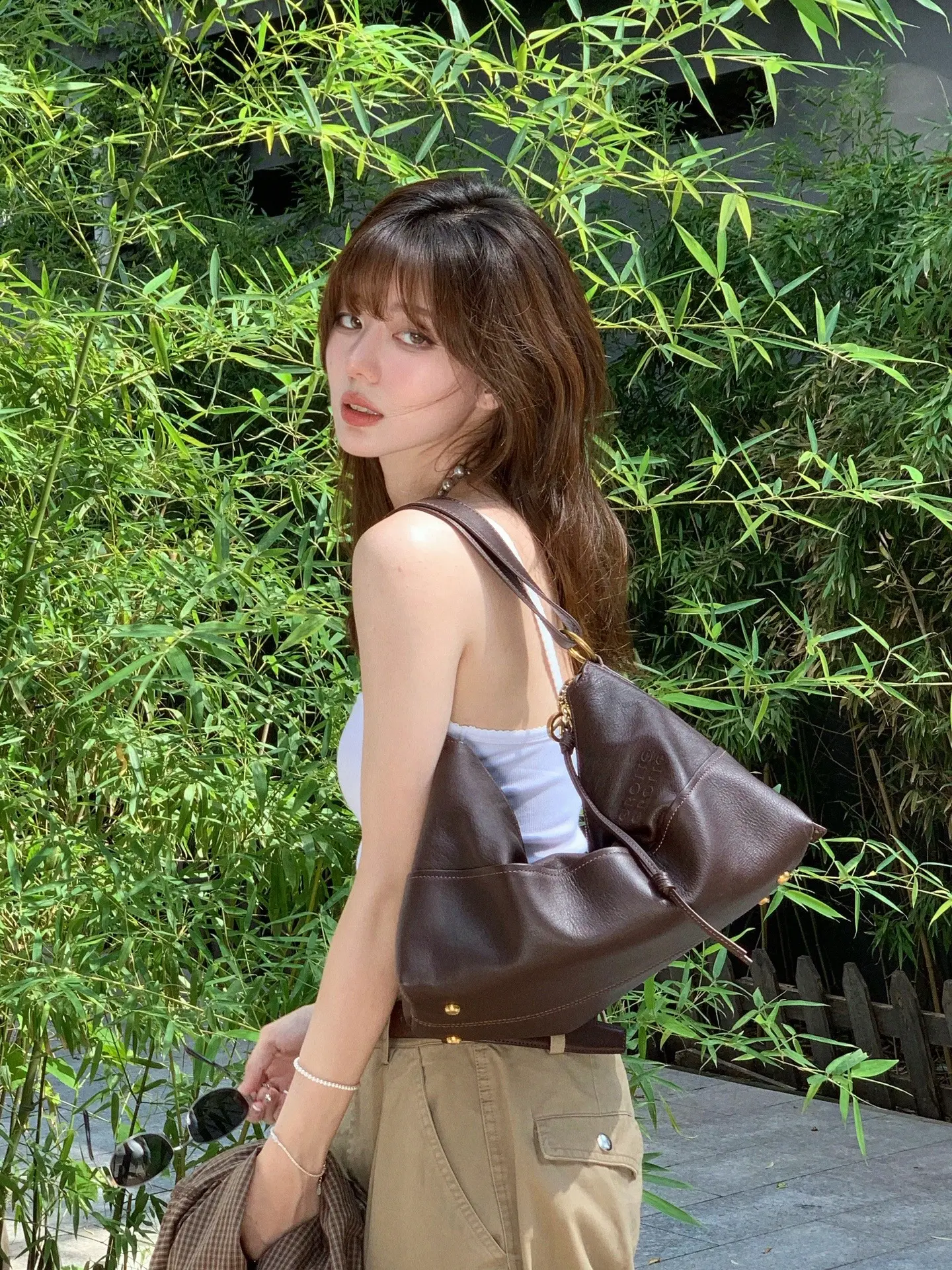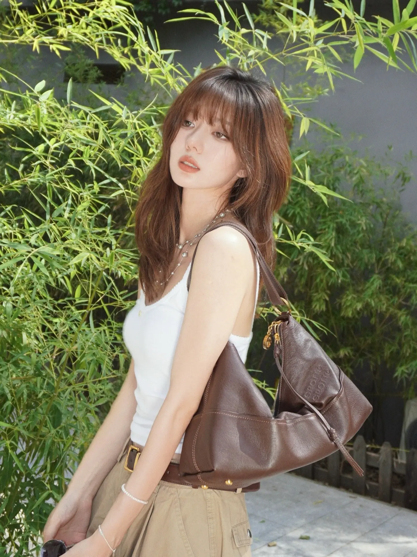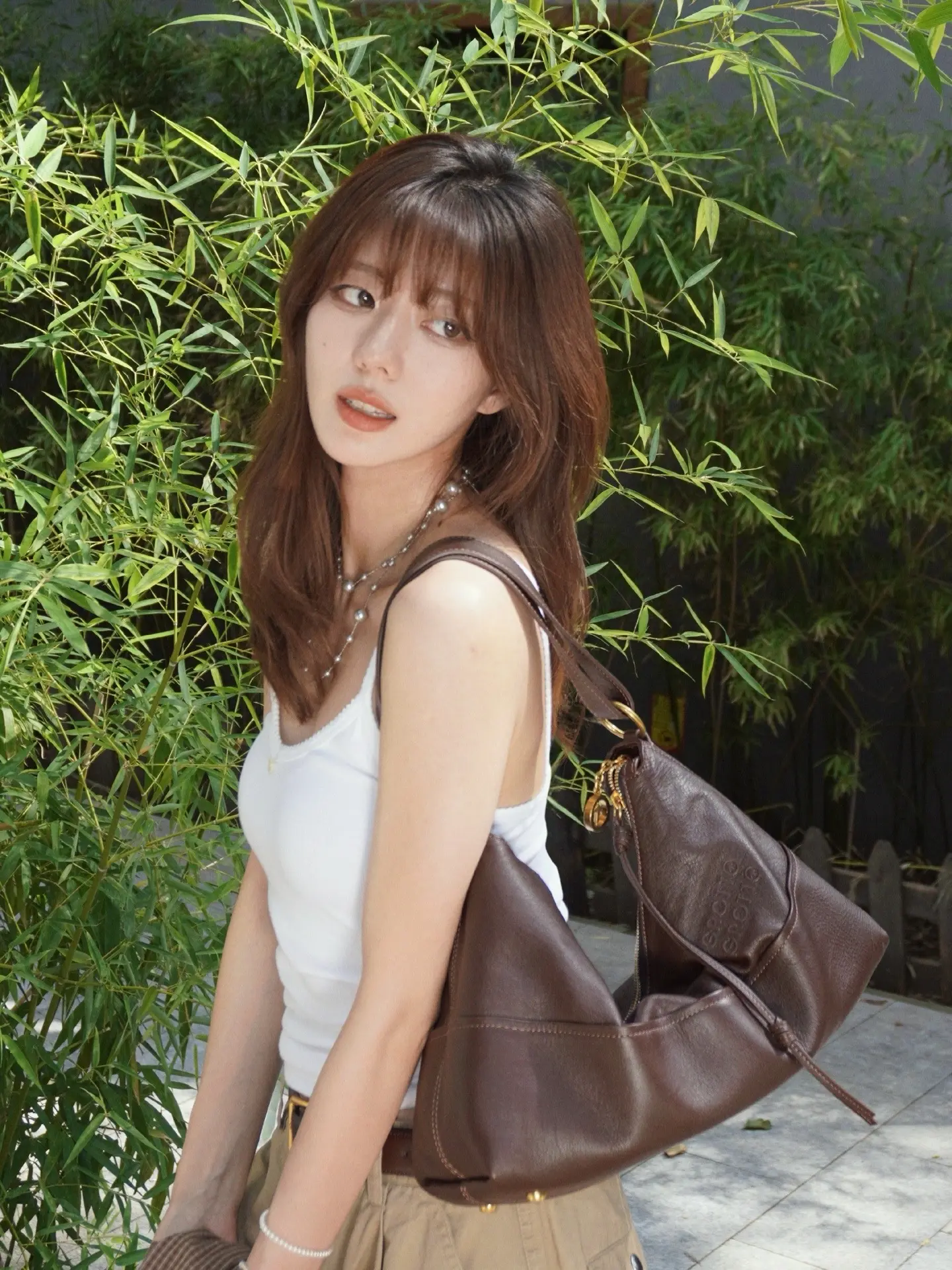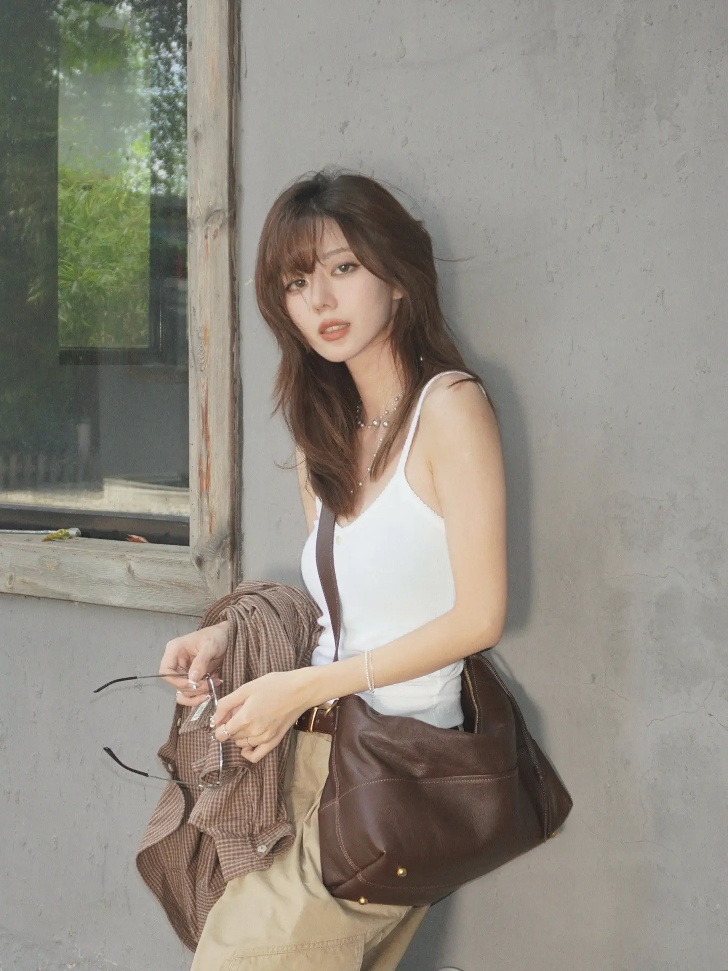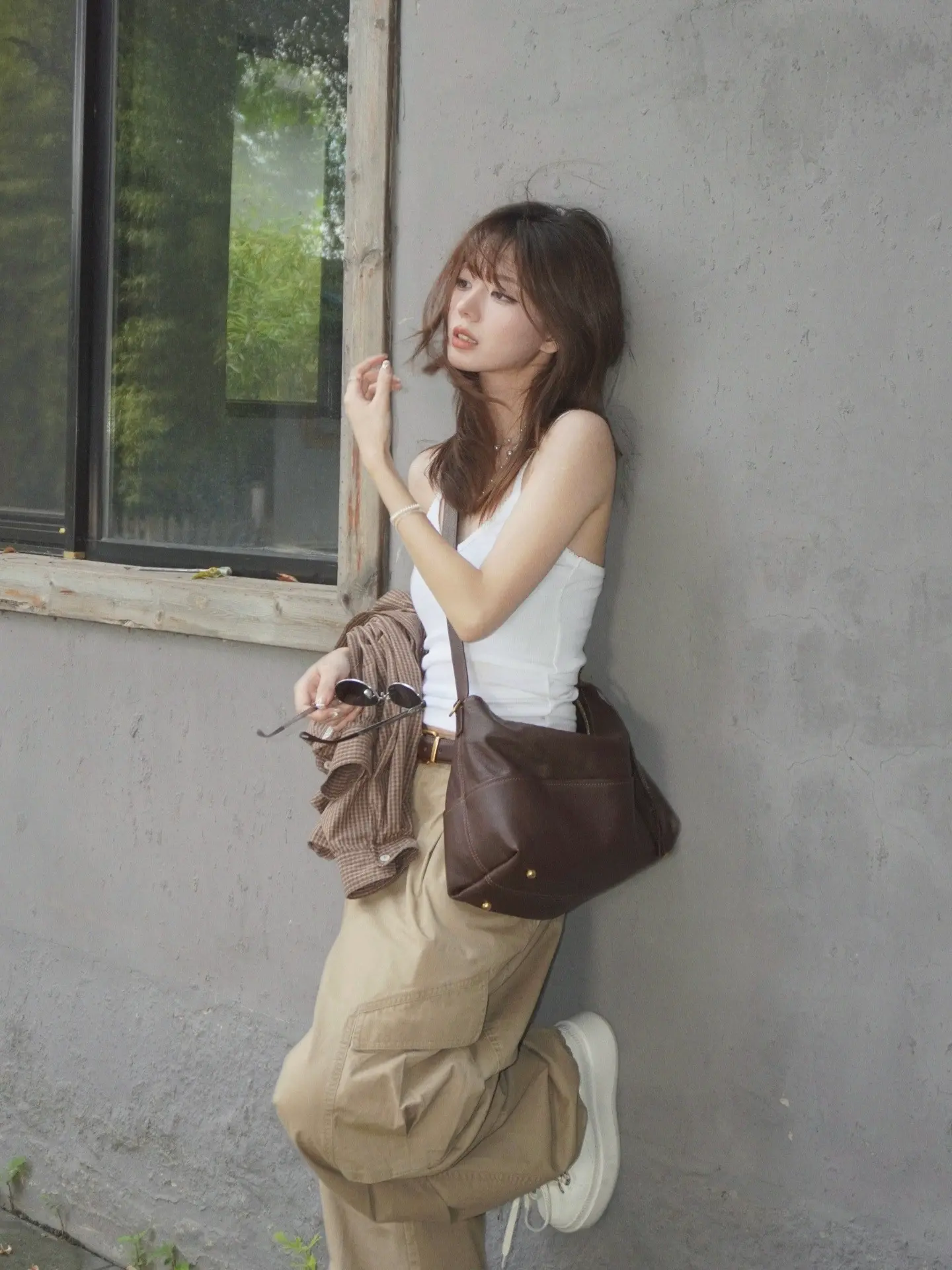 白+卡其=Never出错|所谓淡极生艳。「淡极生艳」的穿搭哲学——是让基础款在细节里开出花 看似「淡」到骨子里 但是用同色系深浅差打造层次感 白色基础款吊带+卡其工装裤+棕色皮质大容量包包 (偷偷说:这种配色对黄皮超友好!)