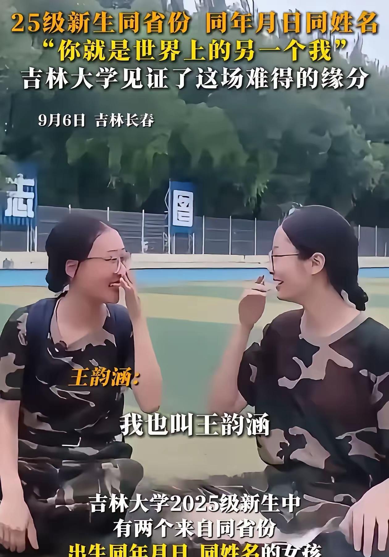 吉林大学25级新生军训, 俩女生聊得可欢了,本来以为就是普通的新朋友。结果一介绍名字,俩人都懵了:“我叫王韵涵!”“我也叫王韵涵!” 更绝的是,接着一唠,发现居然是同年同月同日生!这也太巧了吧,简直像从平行世界里走出来的另一个自己。 俩人当场就笑开了花,这奇妙的缘分,让刚认识的她们瞬间亲近不少。想想以后在吉大一起上课、吃饭、参加活动,得多有意思啊。 网友们也都被这缘分惊到了,纷纷留言:“这不得成为一辈子的好朋友啊!”“太神奇了,平行世界的另一个自己”,你觉得神奇嘛?