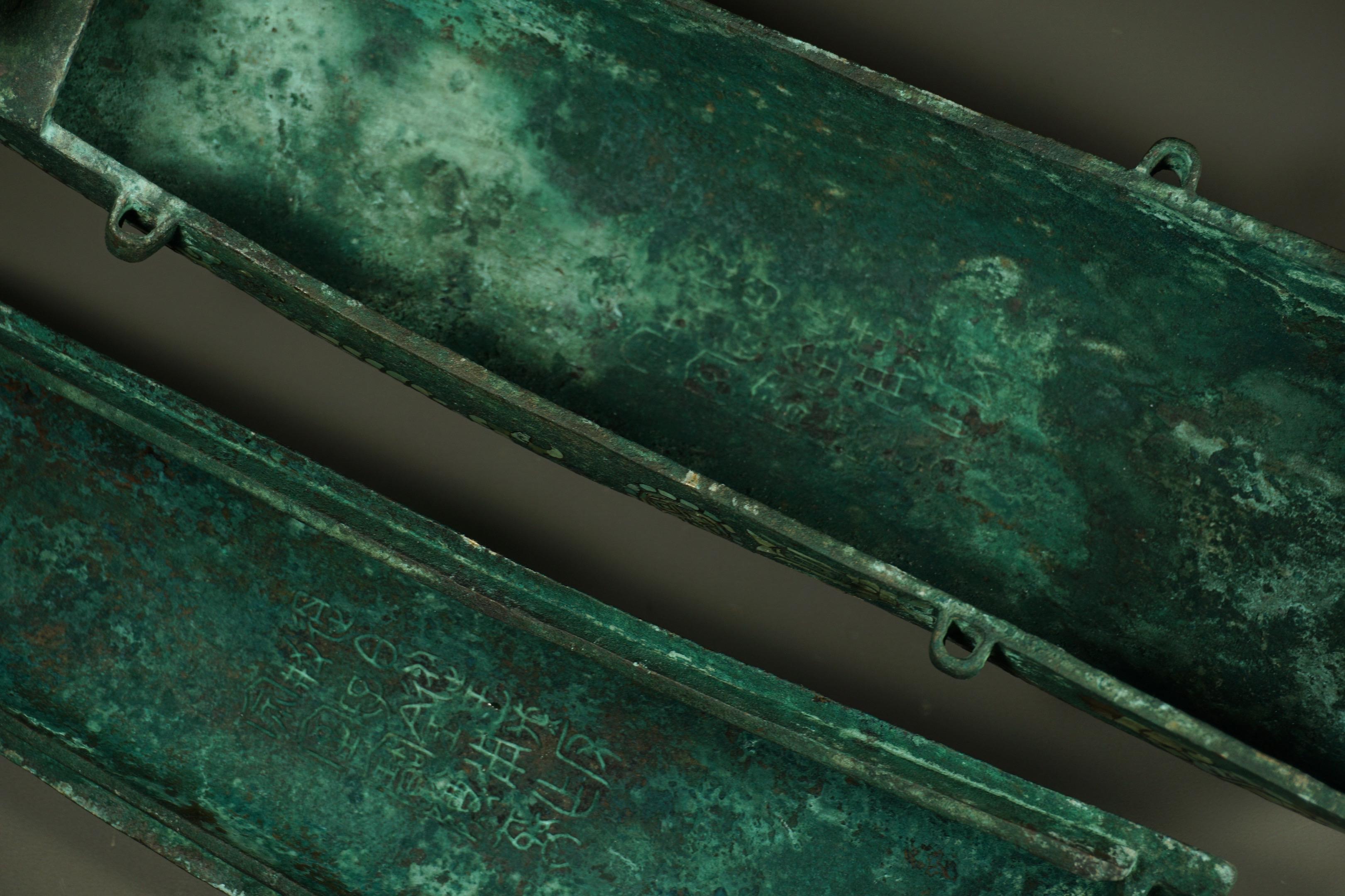 青铜错金银钩镶。青铜错金银钩镶,长64公分,作为一种攻防兼备的冷兵器...
