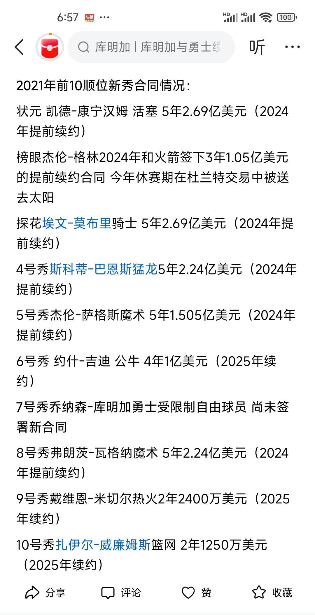 难怪库明加一直那么坚持要高薪要离队,你看看21届前十顺位选秀的球员都签订的是什么合同? 库明加身为七号秀混在里面,要是不签个大合同还怪不好意思的咧! 话说21年选秀年猛不猛不知道,但是这一届的球员都能赚钱是真的! 状元康宁汉姆,活塞5年2.69亿, 榜眼杰伦格林 3年1.05亿,火箭签约,现在太阳! 探花埃文莫布里骑士,5年2.69亿! 四号秀斯科蒂巴恩斯猛龙 了年2.24亿! 5号秀杰伦萨格斯 魔术 5年1.505亿 6号秀吉迪公牛 4年1亿 七号秀库明加 暂时没有签约! 8号秀佛朗斯瓦格纳魔术 5年2.24亿 至于第九第十,同样一个两年2400万一个2年1200万! 这样的条件下,难怪库明加想要大合同,都是一起走进的联盟,咋你们都是大合同,我啥都没有了呢!#库明加#