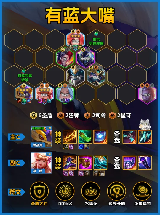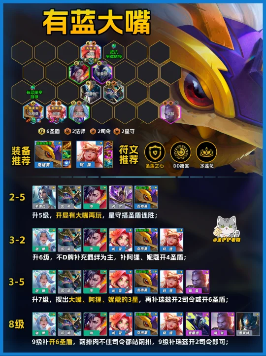 阵容解读: 推荐开局有大嘴或2阶段能刷出来再去玩,如果有神器黎明之心2星都有吃鸡能力,3星能爆杀3星四费!有蓝同享能让阿狸快速施法,所以阿狸带3输出不需要启动7人口追出3星即可,8级开6圣盾,9级补瑞兹开2司令 装备方面: 大嘴:羊刀/铄刃、青龙刀、黎明之心/羊刀 阿狸:帽子、法爆、破防 妮蔻:板甲、绿甲、狂徒 海克斯推荐:拿两个战力+1个经济类海克斯即可 果实推荐: 大嘴:有蓝同享/游神 妮蔻:抵抗/身体转换