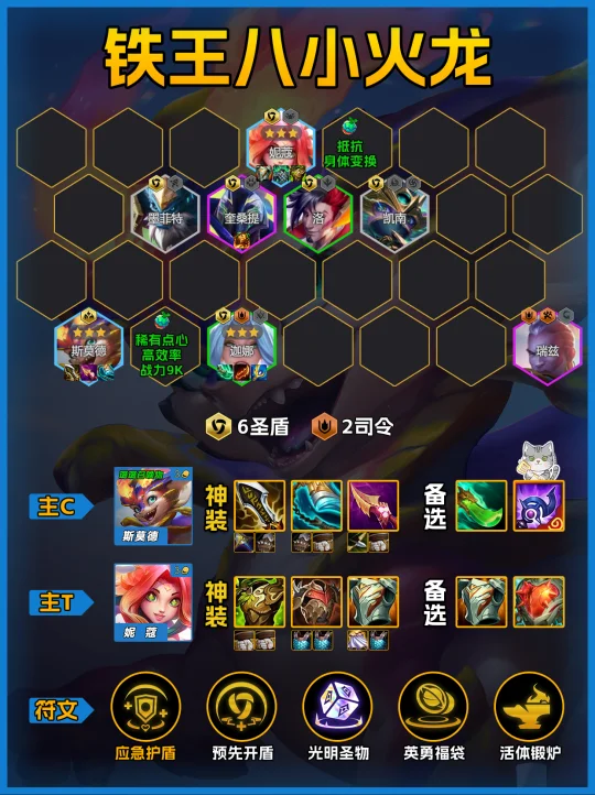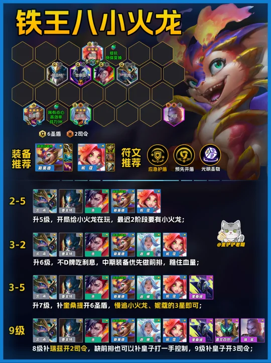 阵容解读: 版本更新小火龙属性整体加强,体系内风女3星后也得到加强!推荐开局有小火龙去玩这套阵容,或者2阶段有小火龙也可以玩!中期整体偏弱多保留血量,7级抽双3星锁血,上8补司令即可 果实推荐:斯莫德:稀有点心/高效率/战斗力9k 妮蔻:抵抗/身体变换 装备方面:斯莫德:无尽、破防、纳什/青龙刀 妮蔻:狂徒、反甲、板甲 风女:青龙刀、羊刀 专属强化必拿,预先开盾再搭配1经济+1战力, 英勇福袋快速成型,神器提升整体上限!