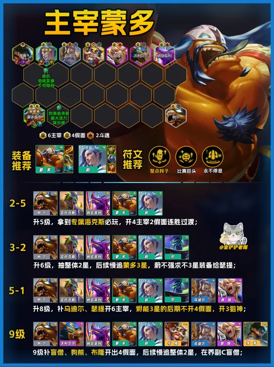 新版本加强非常多,有蒙多装备就可以拿。注意蒙多强化平A是固定扣血,但主宰和假面羁绊能百分百回血,不用担心蒙多会把自己打死!