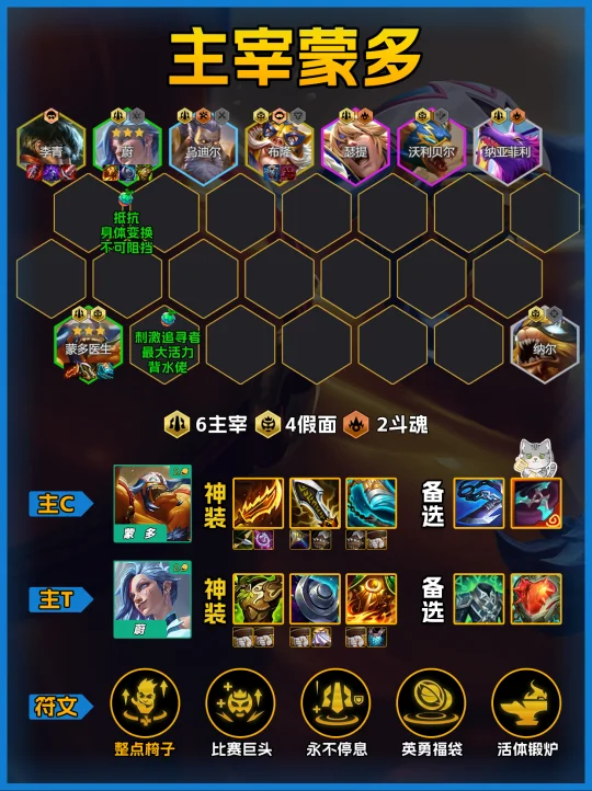 2.如果有斗转开6斗士+4假面,蒙多带转职吃鸡率97%