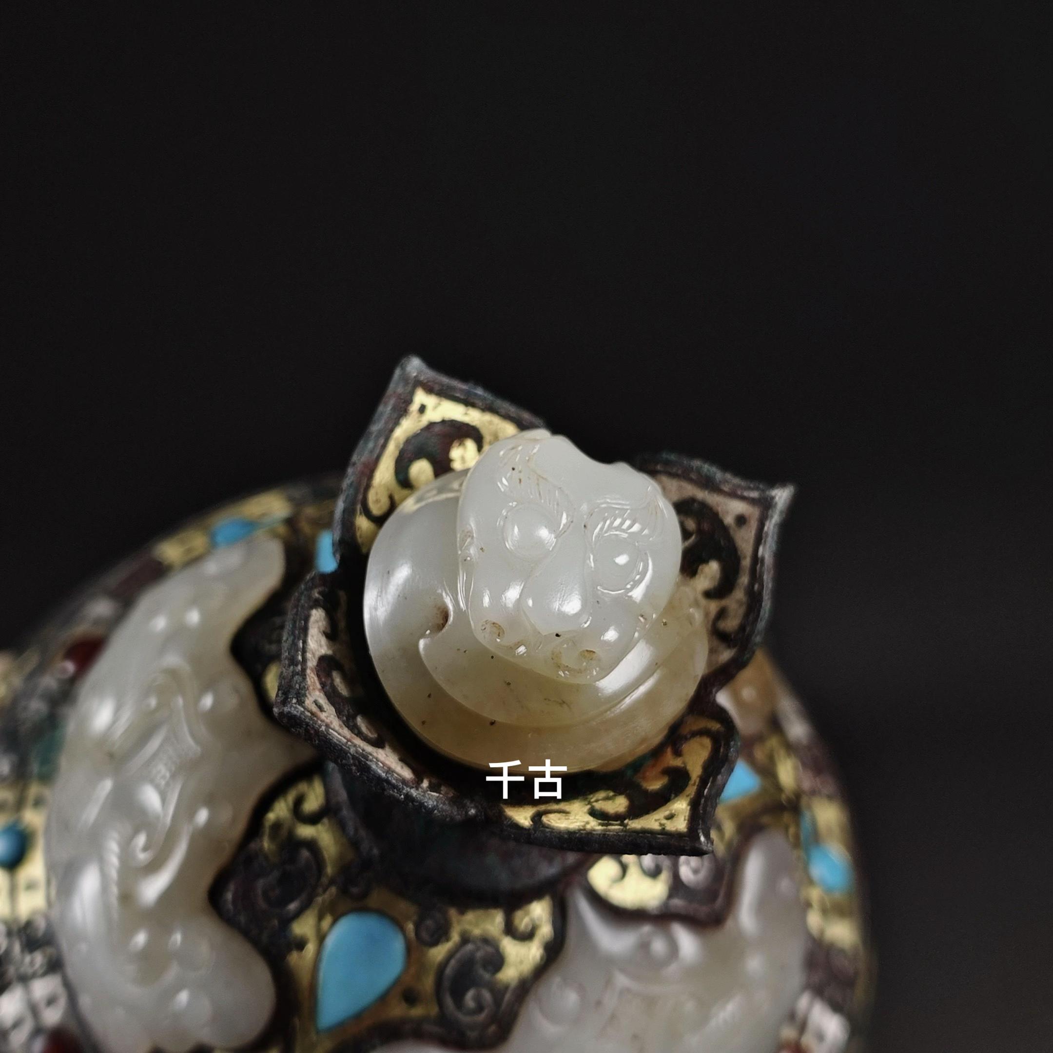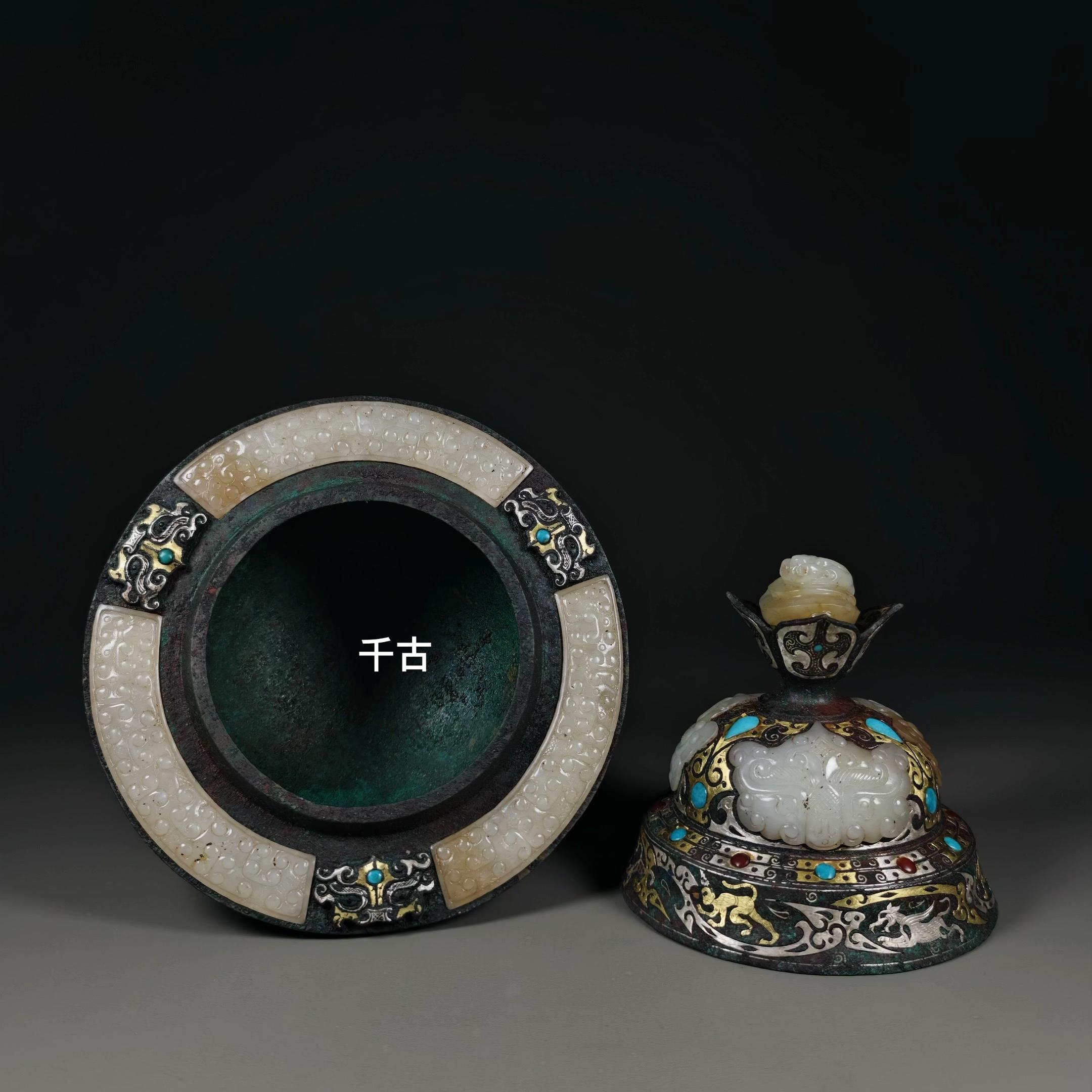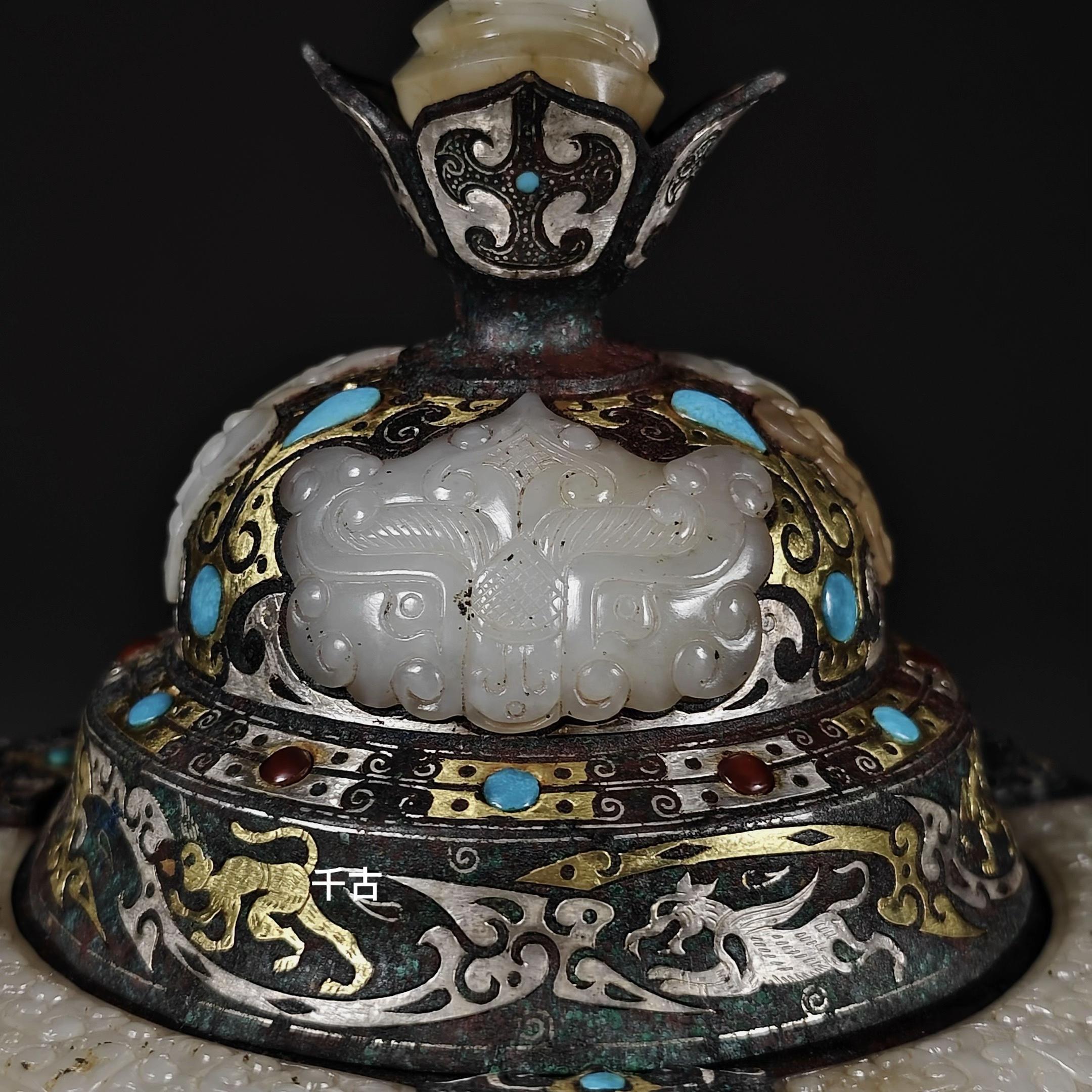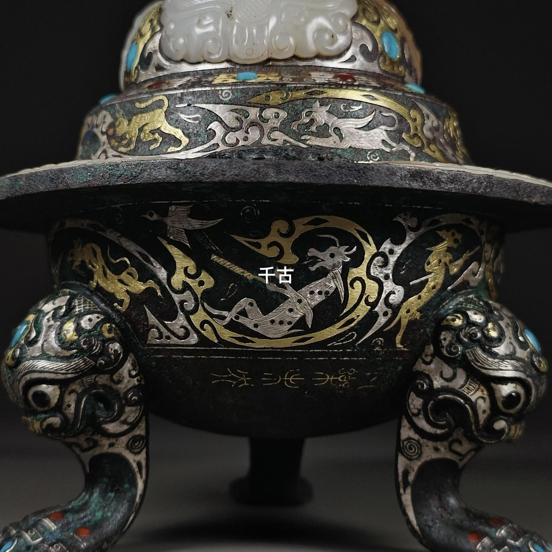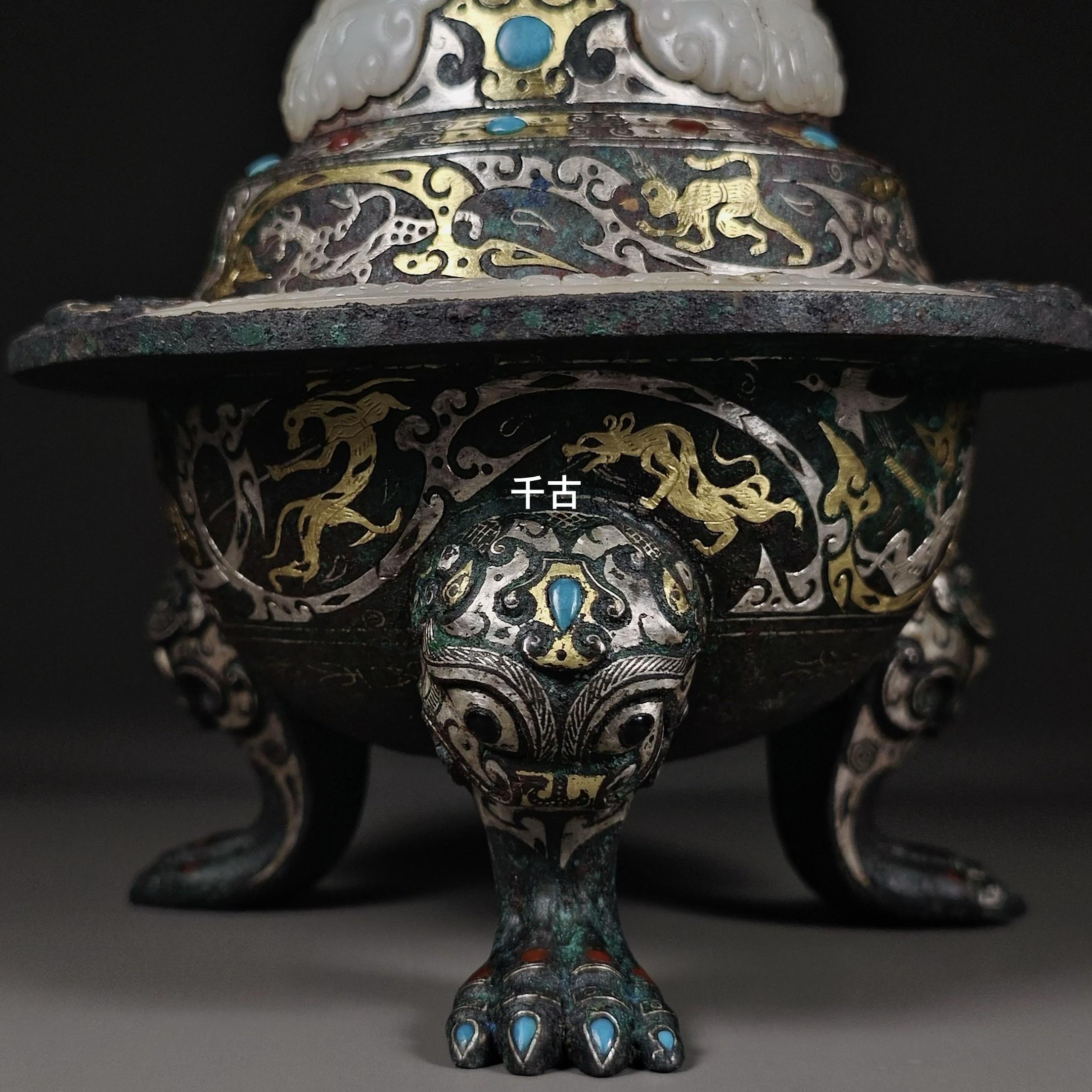 错金银嵌玉熏炉。这是一件汉代错金银嵌玉嵌宝香熏,属于古代贵族使用的熏香器具。它采用了错金银工艺,在铜器表面的凹槽中嵌入金、银丝,再打磨抛光,形成华丽的纹饰;同时镶嵌了和田玉与绿松石、红宝石等宝石,还搭配玉质炉钮与炉沿装饰,工艺极为精湛。这种香熏不仅是实用的熏香工具,更是身份地位的象征,体现了汉代高超的金属工艺、玉器雕琢技艺,以及当时贵族追求雅致生活与神仙信仰的文化背景。