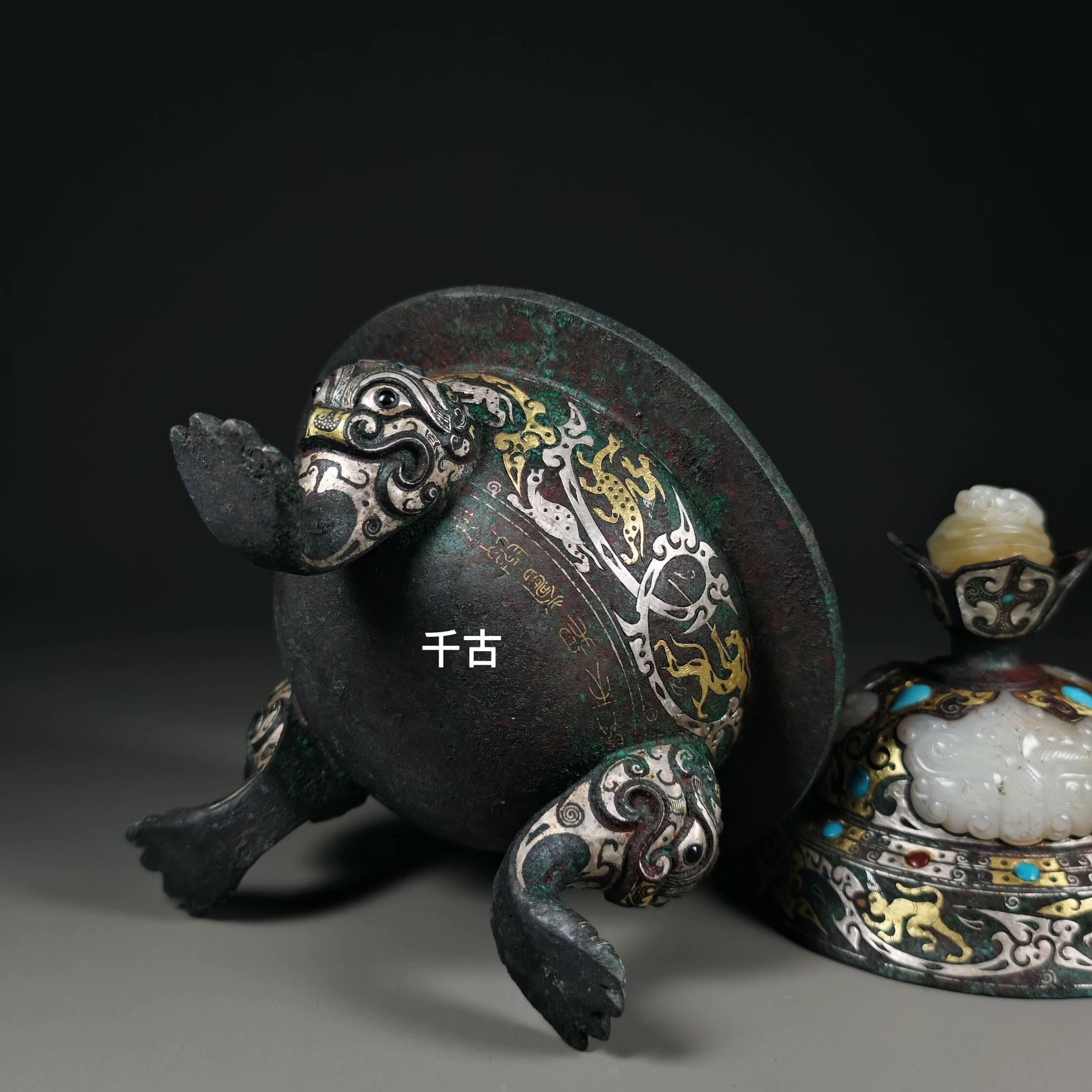 青铜龙镇。这件青铜器通身布满细密的蟠虺纹与云纹,每一道纹路都由失蜡法精...