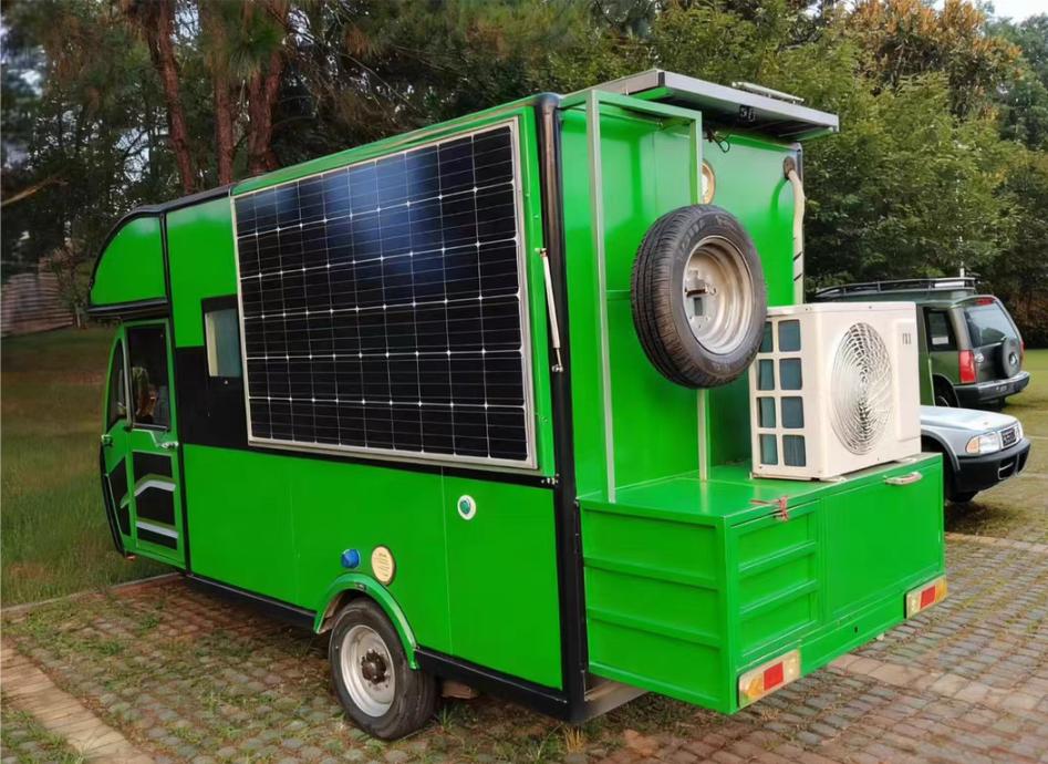 青蛙绿喷漆,纯电动三轮房车来了,太阳能板加持出行费用更低。这是一台电动三轮房车,大额头C型房车结构,整车尺寸为4.5m×1.6m×2.3m,青蛙绿喷漆,靓丽而充满朝气;封闭式驾驶室能够遮风挡雨,方向盘操作长途更轻松;4000瓦交流电机动力充足,72伏200安锂电池续航够用,车顶和侧面太阳能板有光就能发电,大大节约了出行费用;室内左侧是一张纵向单人床,上部有木制吊柜、驻车空调和车载冰箱,前面额头柜下面还有移动电视,作为露营时消遣使用。在如今的房车领域,论经济实用性非三轮房车莫属,真正的大众化亲民房车,低成本慢旅行才能静下心来欣赏沿途的风景。三轮房车 电动房车