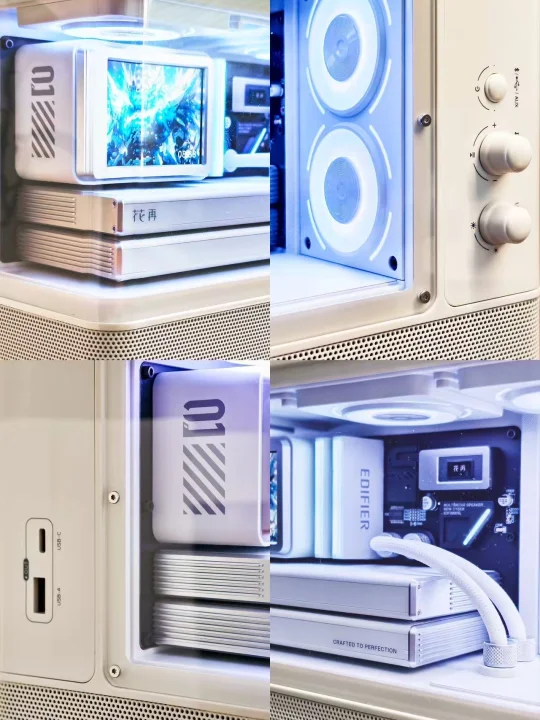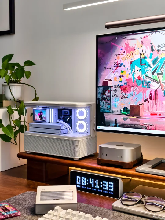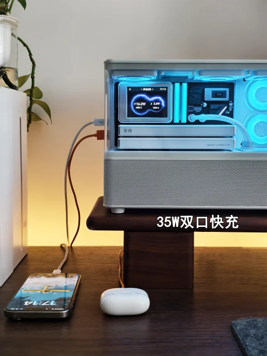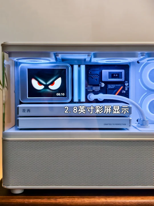 白色长方海景房机身自带赛博科技感,整体的外形延续了花再New系列标志性的集装箱设计,正面嵌入的2.8英寸彩屏就像水冷头样式,让人惊艳的是风扇灯效,摆在桌面上第一眼望去,就像一个迷你“海景房主机”,视觉辨识度直接拉满。