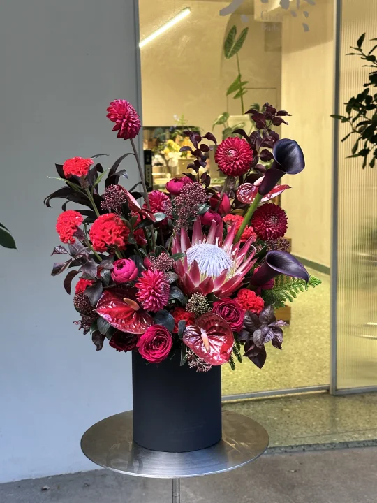 :南非红帝王、红大丽花、红鸡冠花、茵芋、花烛、多头红蕾丝玫瑰、海芋、巧克力朱蕉、南洋杉、红叶李…