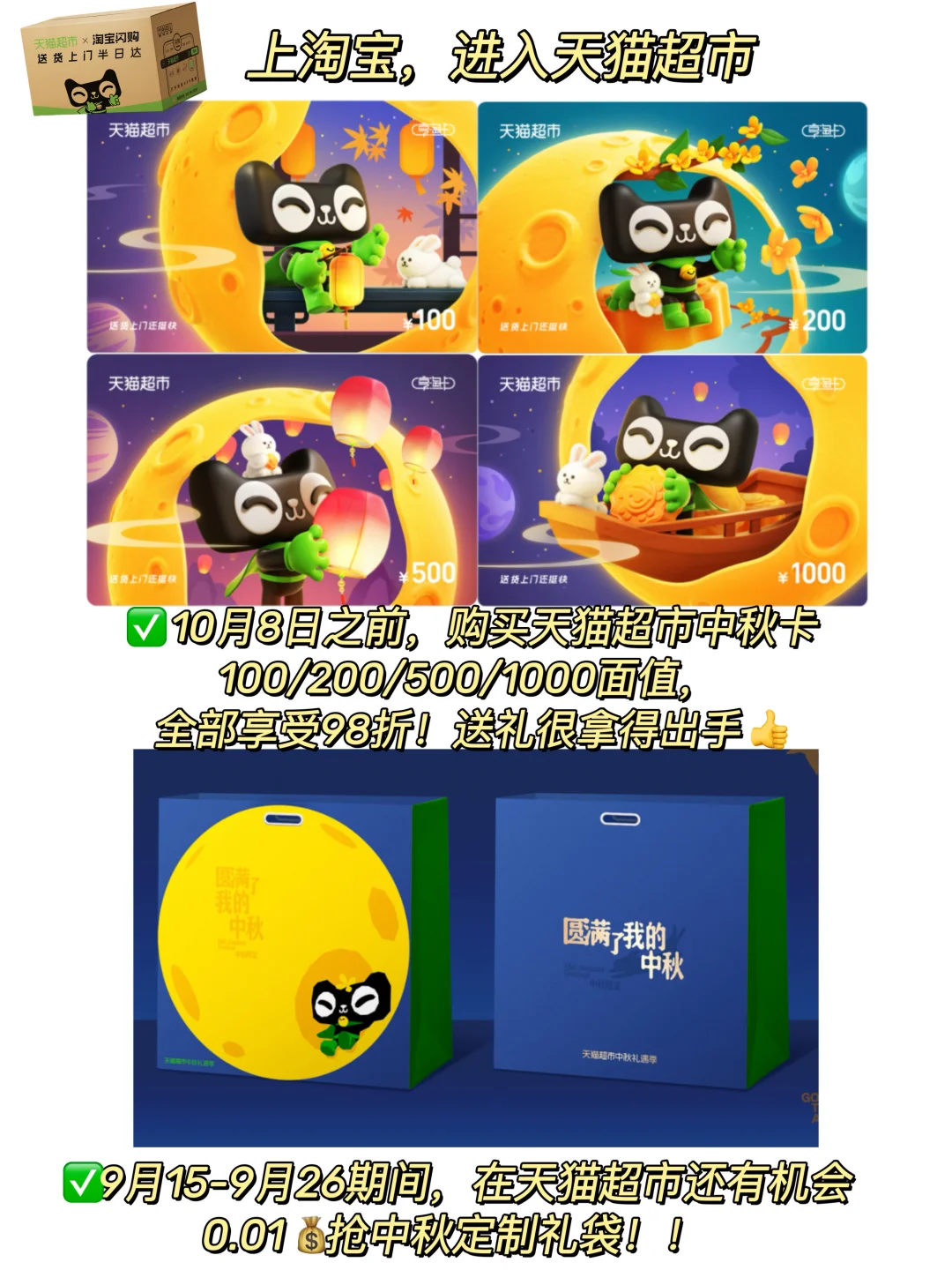 🔥9月15-9月26期间,在天猫超市还有机会0.01💰抢中秋定制礼袋!!
