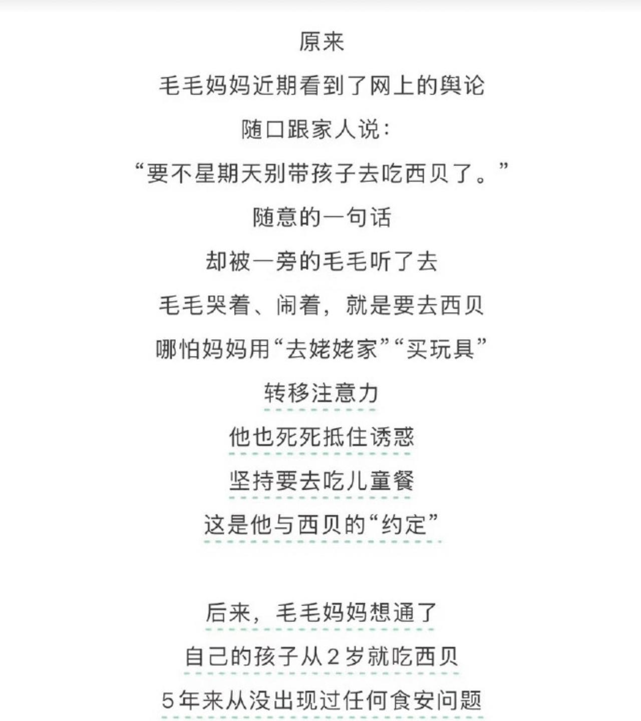 始祖鸟刚抢走一点流量,又被西贝抢回去了。7岁毛毛的温情公关,从发布起就备受质疑。9月23日,西贝删除了这个视频。 7岁孩子本是上小学1、2年级的年纪,在西贝这里是上幼儿园,网友说是吃西贝吃的。7岁孩子能抱住阿姨大腿,身高应该在110cm,而这个身高是3、4岁小孩的身高,网友说是吃西贝吃的停止发育了。合理闭环了。 西贝的菜是不是真菜不知道,但是西贝的公关是真菜。从老板到员工。脑子和正常人类不一样。西贝做这个公关,还不如不做,每次西贝出来发声,都是自己捅自己的方式。看着都有点于心不忍了。 西贝做这么多,还不如真诚点,处理一下冰柜里面那些1、2年的食物,找一下出现这么久冷冻食品的原因,自我检查一遍,给公众一个交代。会比这种抖机灵的狡辩有用多了。 #西贝删除温情公关文# #万能生活指南#