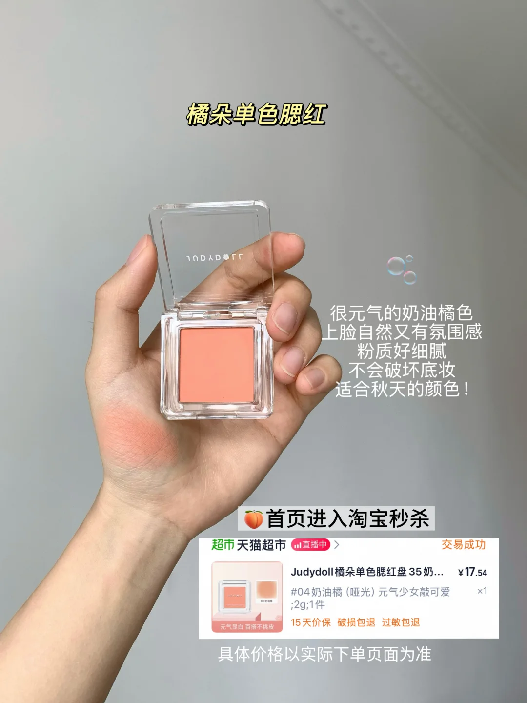 🫧橘朵腮红:这个奶油橘色真的好元气,像自己皮肤透出来的健康气色,关键是粉质细腻不飞粉,完全不用担心会破坏底妆,秋天用它正正好!