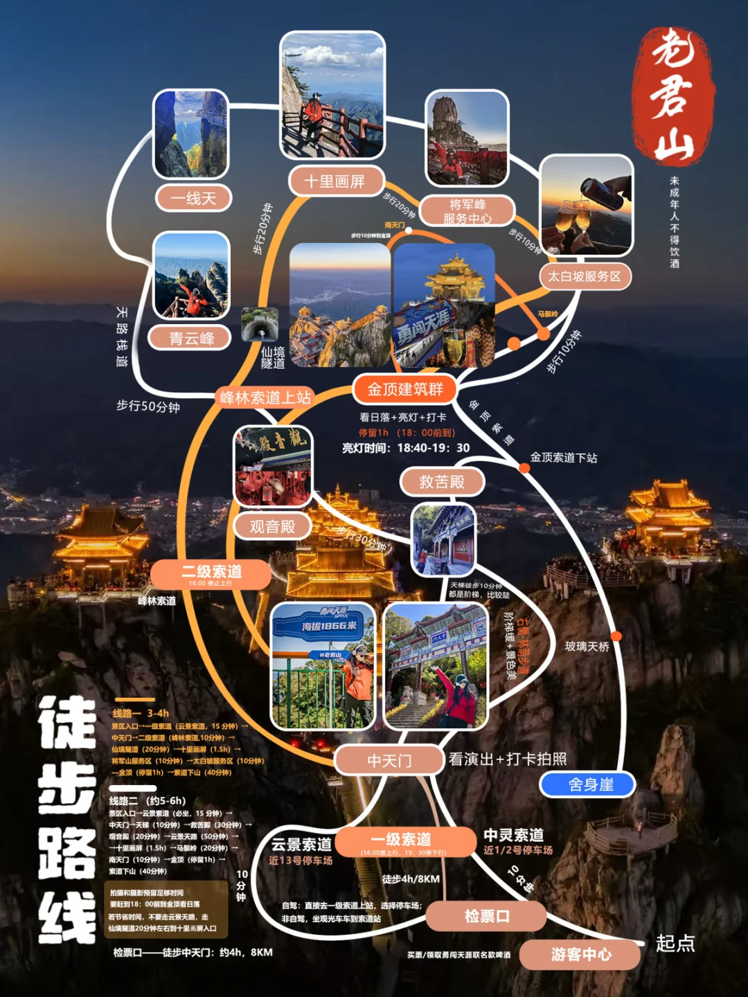 景区入口→云景索道(15 分钟)→中天门→救苦殿➡️一线天→十里画屏(2h)→马鬃岭→南天门→金顶→索道下山