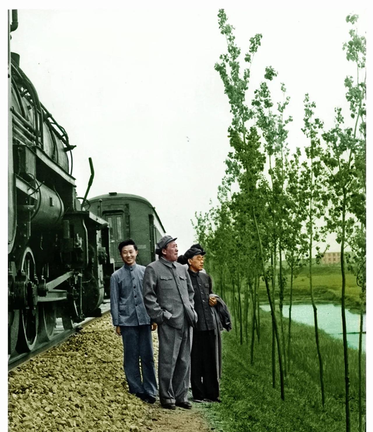 1963年4月13日,毛主席在上海郊区处下车眺望。从图片中可以看到早春上海的景色,铁道旁边的行道树郁郁葱葱,远处可以看到楼房还有一片小水塘。