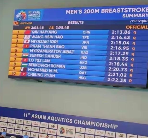 亚洲游泳锦标赛在印度艾哈迈巴德开赛,今天上午结束了9个项目的预赛,中国在其中6个项目排名第一,本次中国队唯一参赛的名将覃海洋在男子200米蛙泳预赛虽然全程收着游,但仍以2分13秒86排名第一晋级决赛。