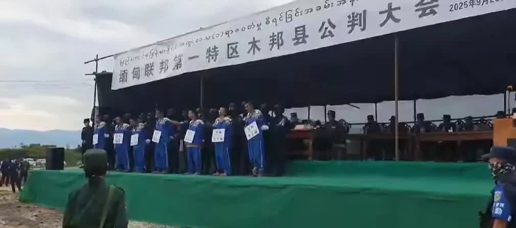 近日果敢同盟军在木邦县召开了一场公判大会,7名犯罪分子站在台上接受特区政府审判。