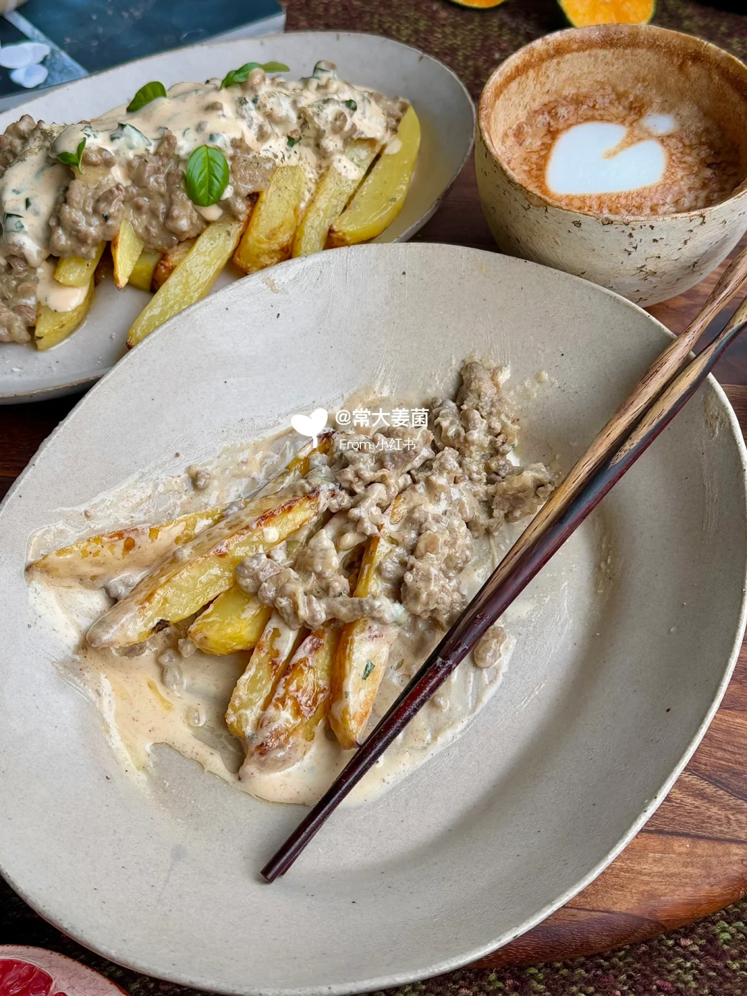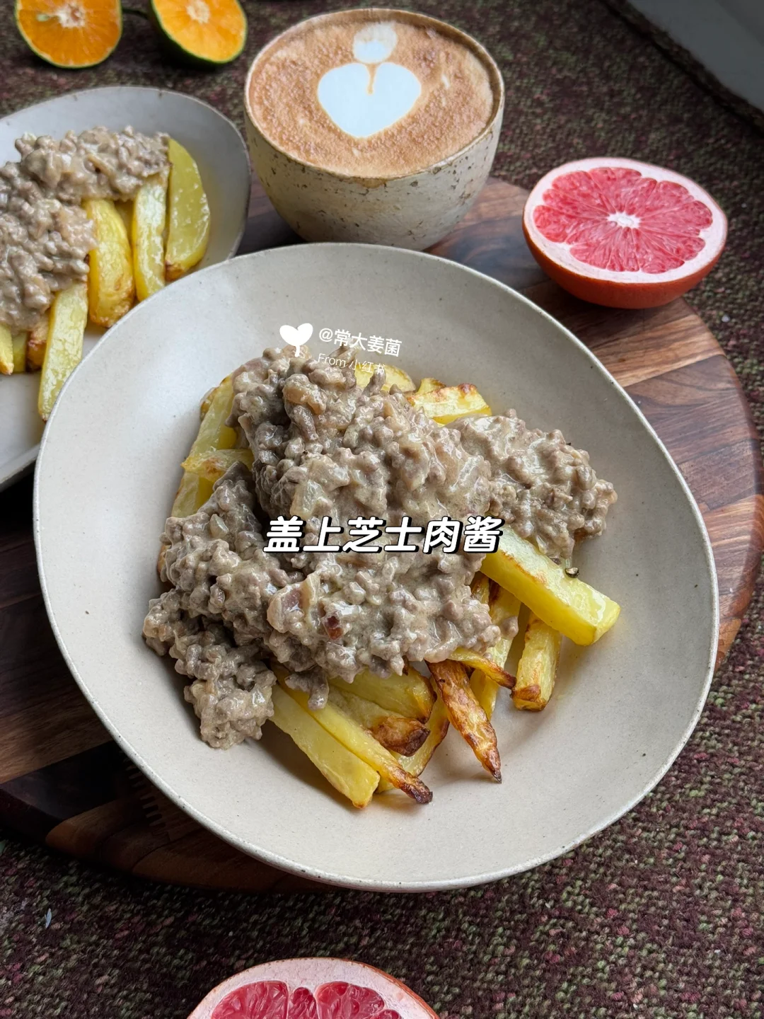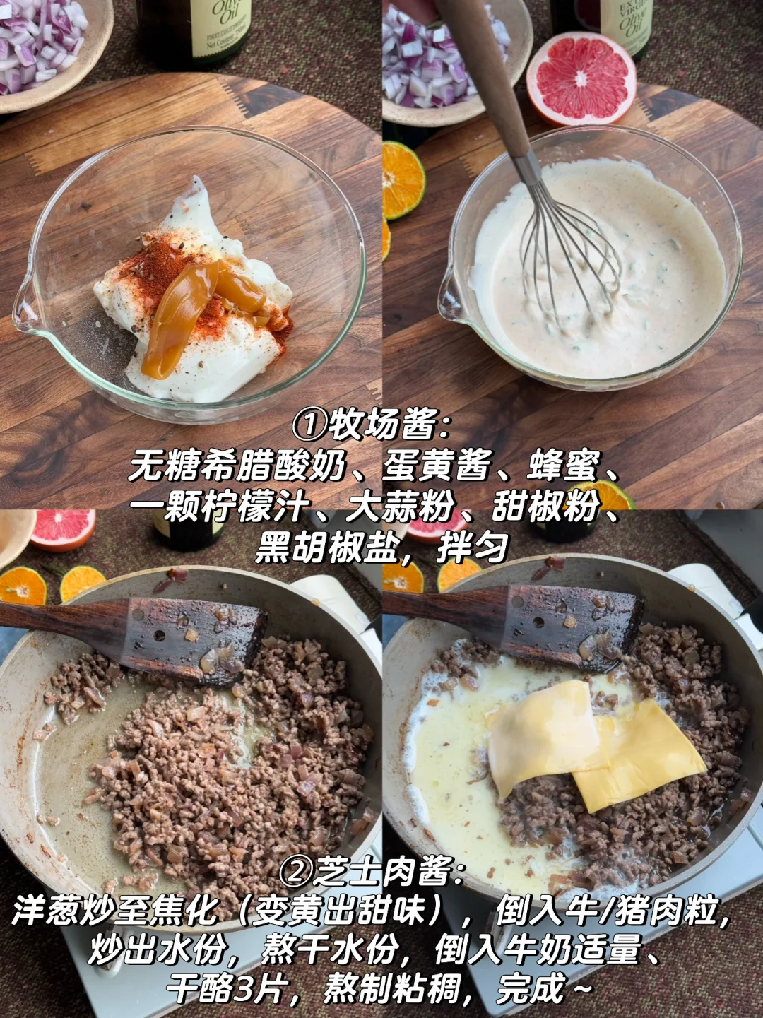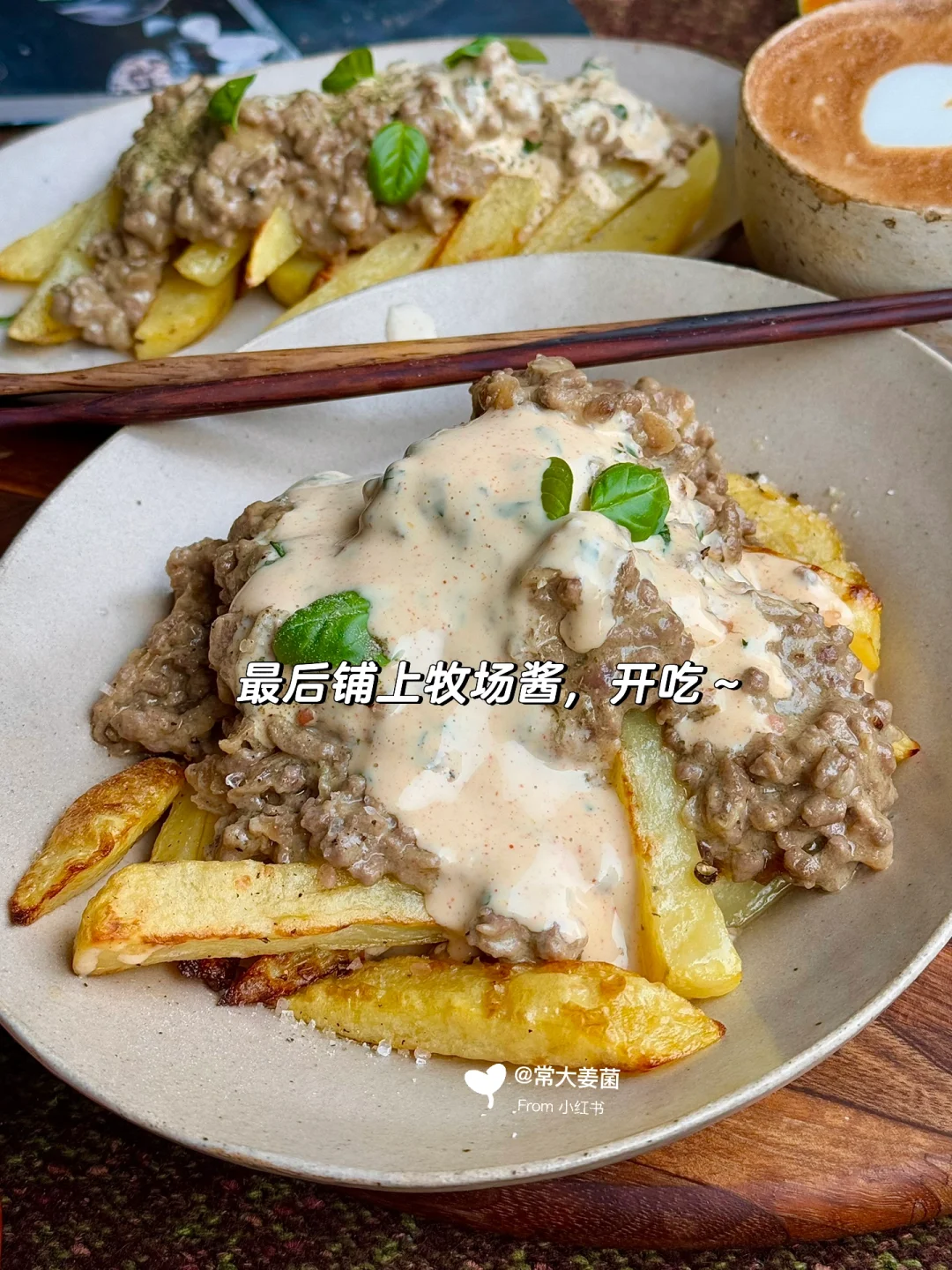 🍟薯条免油炸,可以避免摄入过多的油量, 放入烤箱,省时又焦脆! 🧀牧场酱,稍微不注意可能就偏甜了,可以加入无糖酸奶来中和,根据自己口味调制就成~ 🥩芝士牛/猪肉酱,我用了牛肉,和芝士融合起来,牛肉奶香+芝士奶香,好吃哭!!
