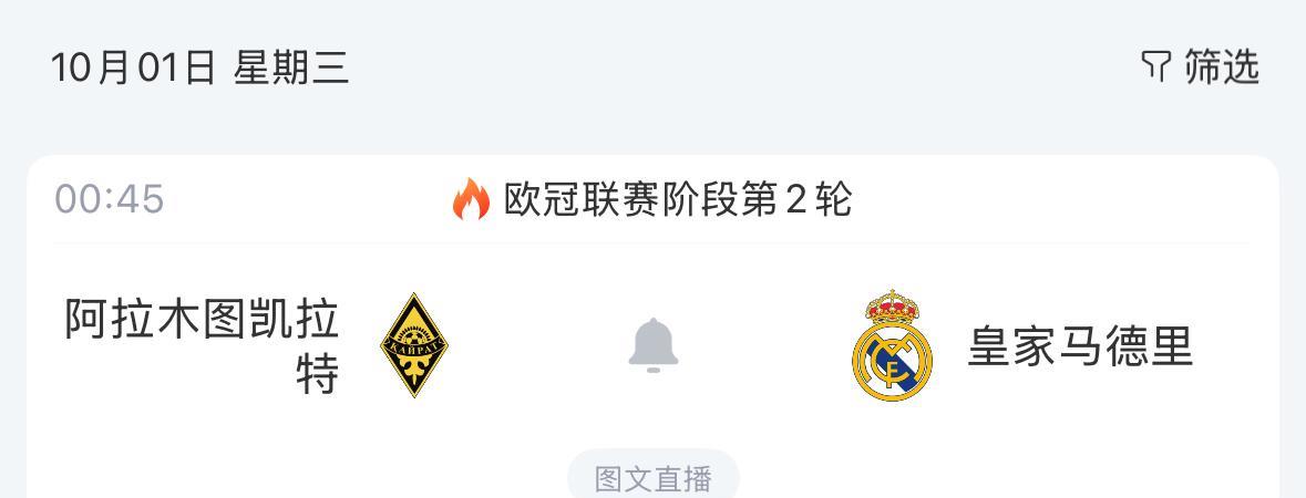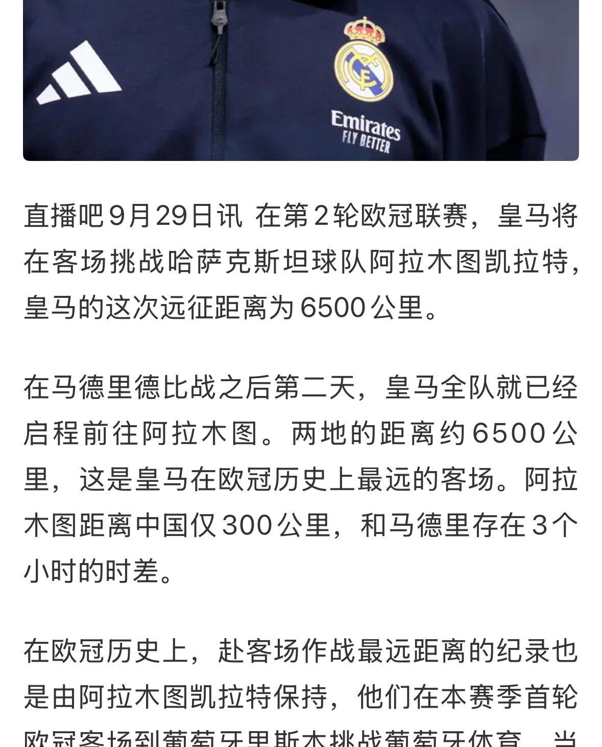 #欧冠联赛# 2025/26赛季,欧冠首轮: 欧冠第2轮,皇马将会在客场挑战阿拉木图凯拉特, 如果阿拉木图凯拉特在自己的主场击败皇家马德里的话,那绝对是一次值得大书特书的胜利。 现在,阿拉木图凯拉特以逸待劳,他们静待奔波6500公里而来的皇马, 另外,皇马在西班牙马德里德比中2:5惨败于马德里竞技,一下子缓不过神来,这也是对阿拉木图凯拉特有利的因素。 皇马客场对阵阿拉木图凯拉特的比赛将在北京时间10月1日凌晨00:45分开球。#皇家马德里# (求转播信号啊)