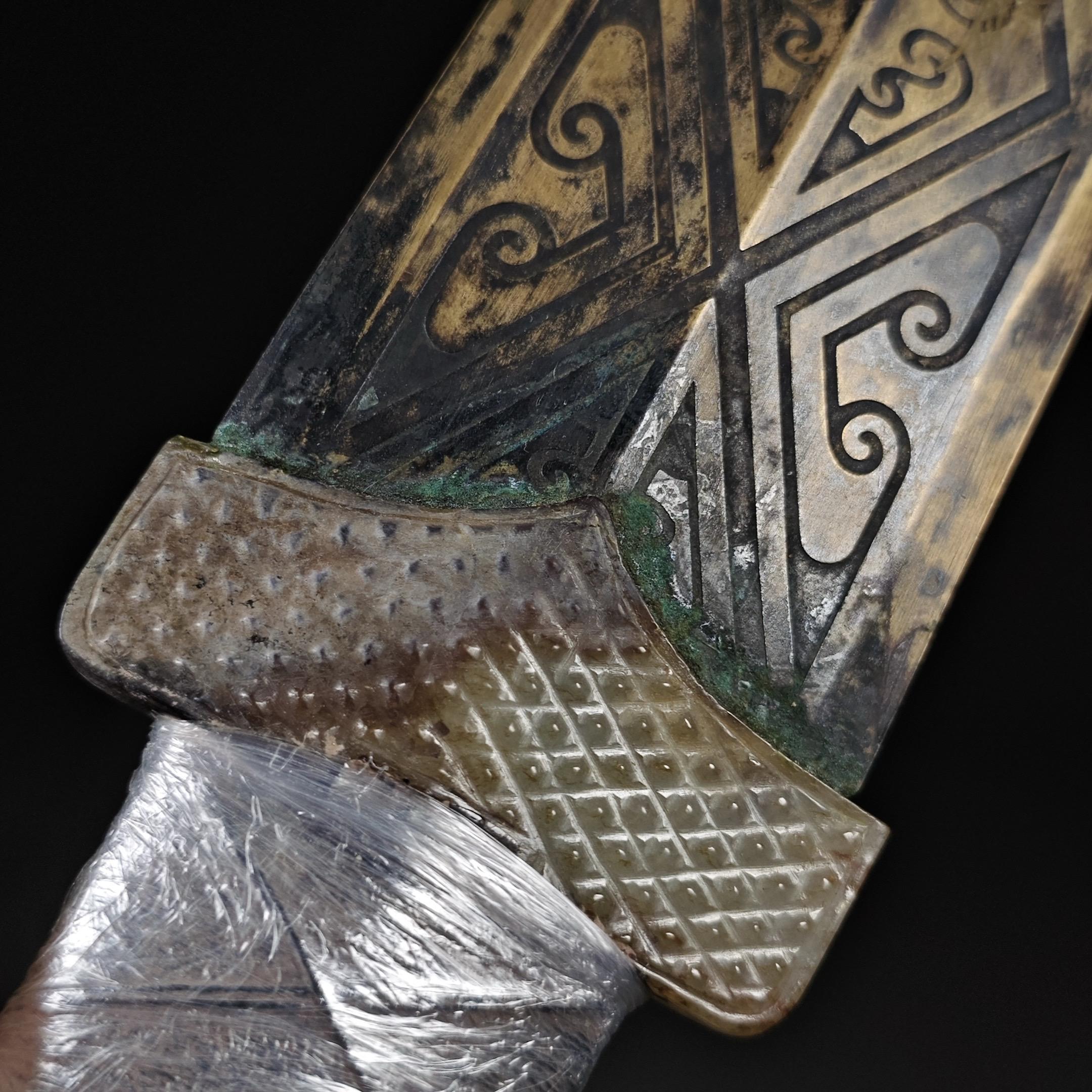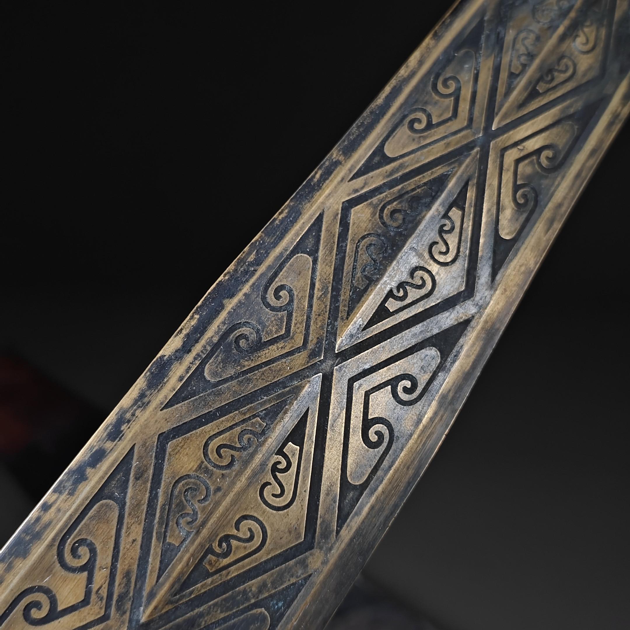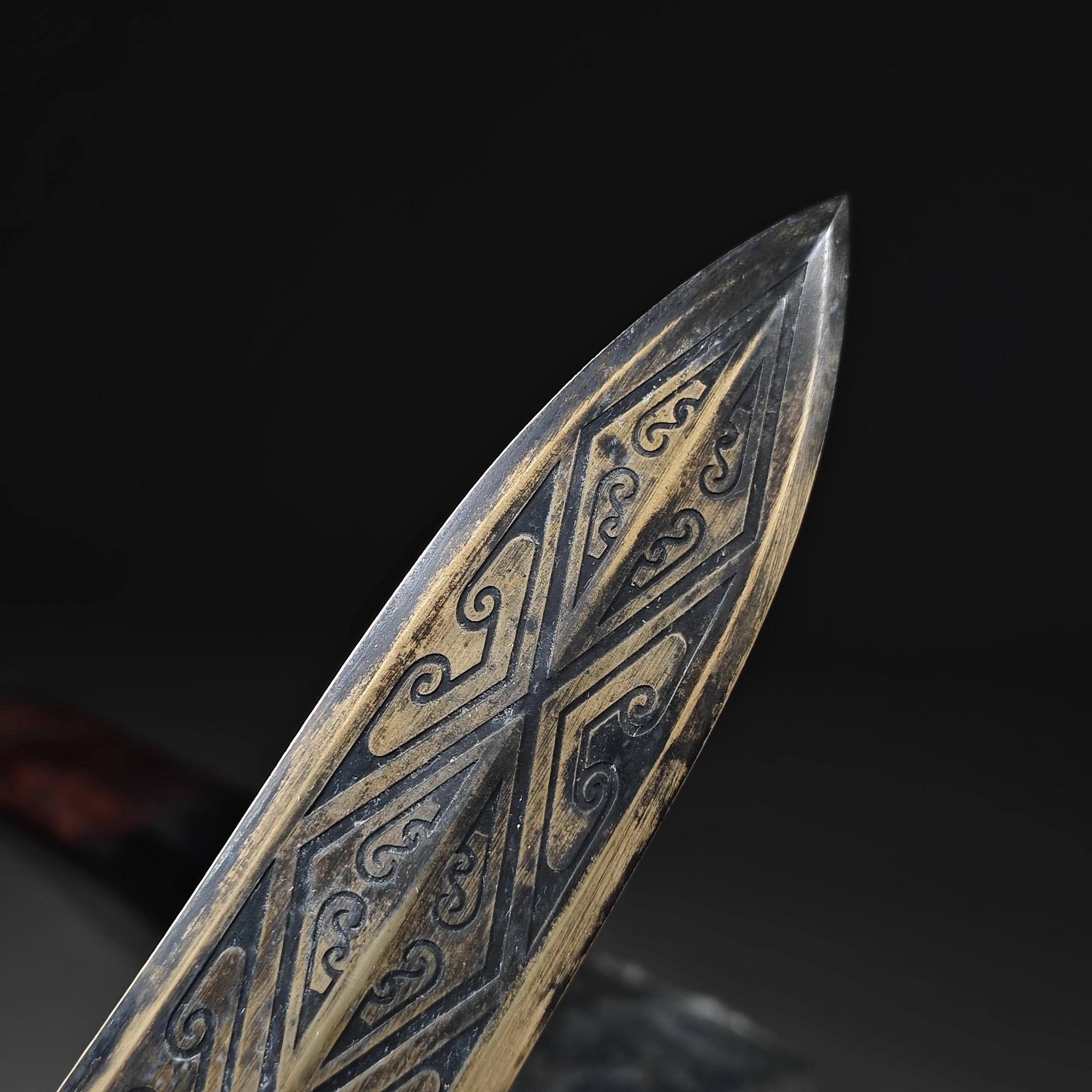 青铜剑。古铜剑,是中国古代的一种兵器。青铜剑是在早期商朝时期由青铜铸造而成,被广泛用于战争与礼仪活动。在历史上,青铜剑曾是中国铸剑的代表,也是中国文化的重要组成部分,对后来的铸剑技艺有深远的影响,青铜剑除了在军事上的应用外,在古代中国的礼仪活动中也有重要地位,在春秋战国时期,贵族们常常携带精制的青铜剑参加祭祀、宴会等场合。•剑是君子的象征,誉与财富,同时也承载着历史的文化内涵。 古兵器青铜剑