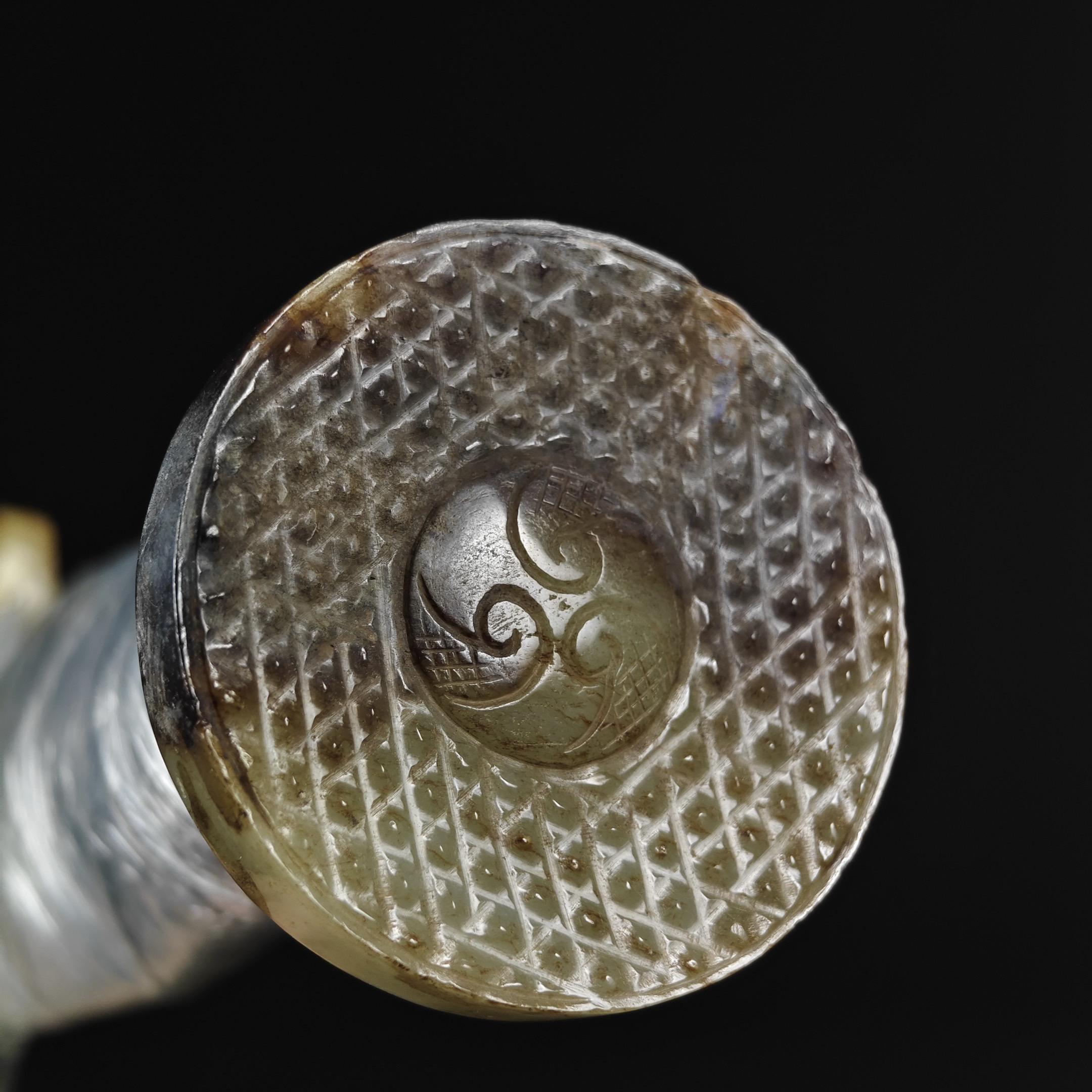 青铜错金银嵌玉勺。一柄匠心独运的勺具。其勺体采用精湛的镂空工艺,轻盈而...